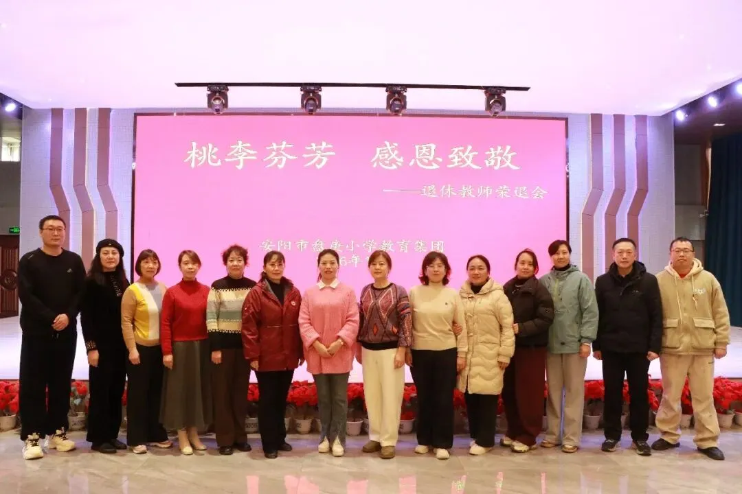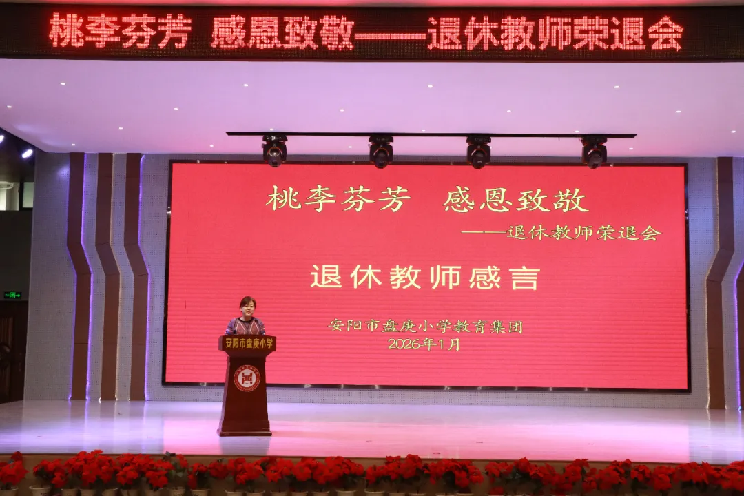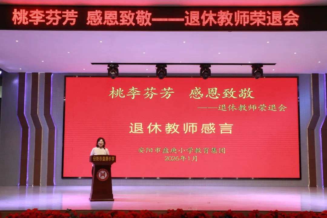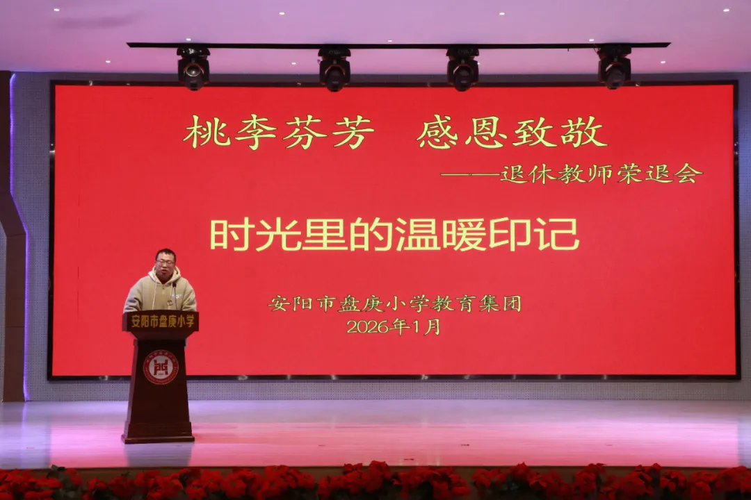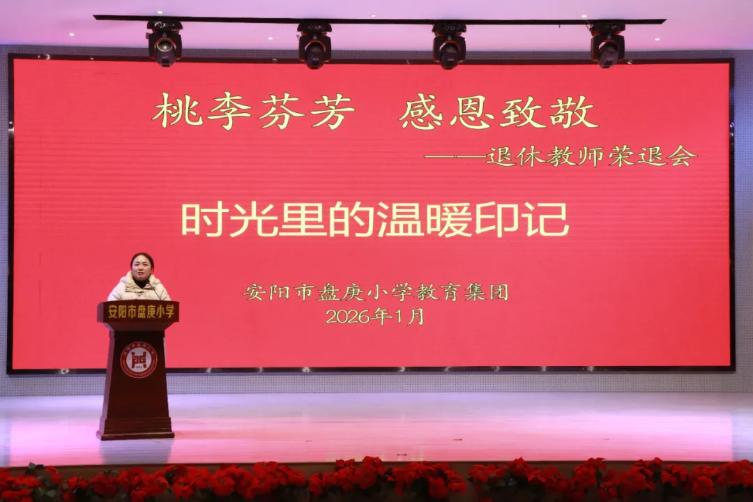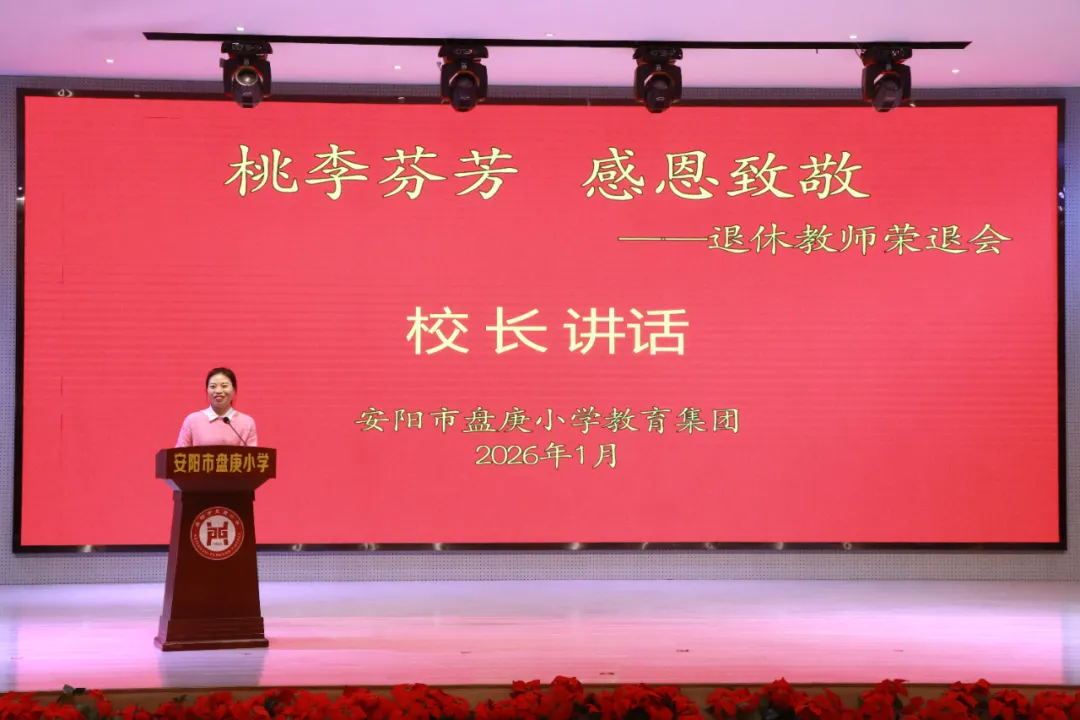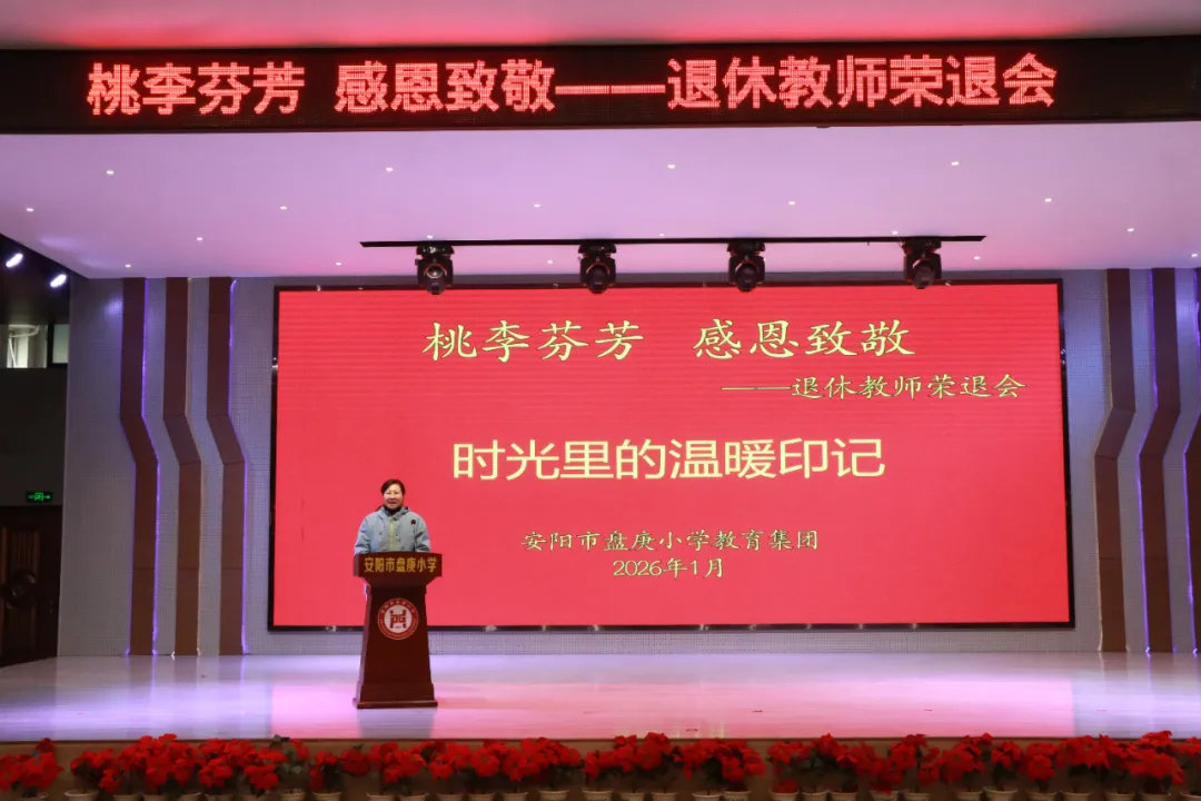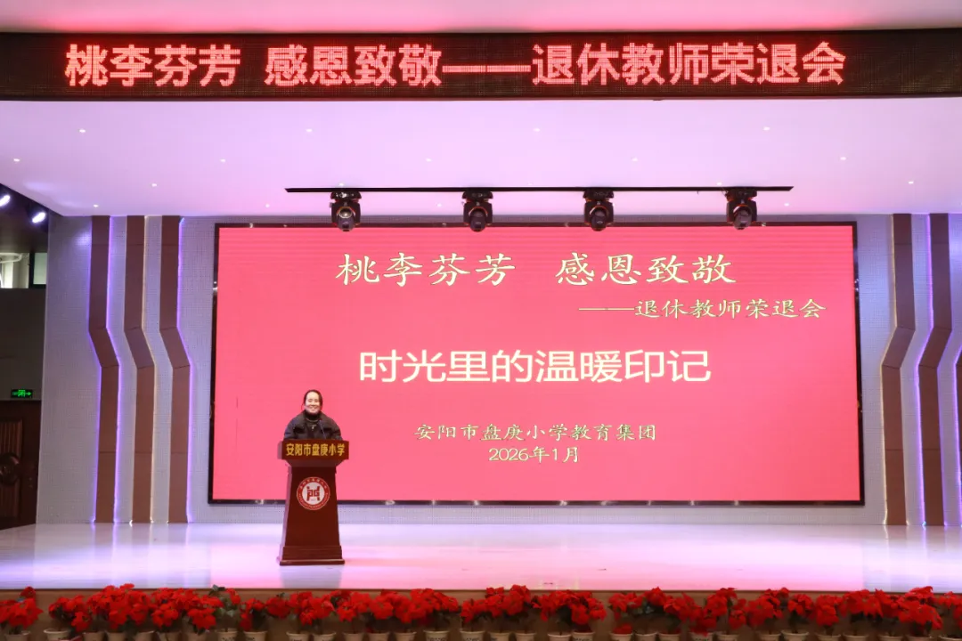 为致敬退休教职工数十年的坚守与无私奉献,传递学校对老教师的深切关怀,厚植尊师重教、感恩奉献的校园文化底蕴,1月26日下午,在安阳市盘庚小学博学楼多功能报告厅隆重举行“桃李芬芳 感恩致敬”退休教师荣退会。学校领导、退休教师及教师代表齐聚一堂,共忆耕耘岁月,共话师者初心,共寄美好期许。