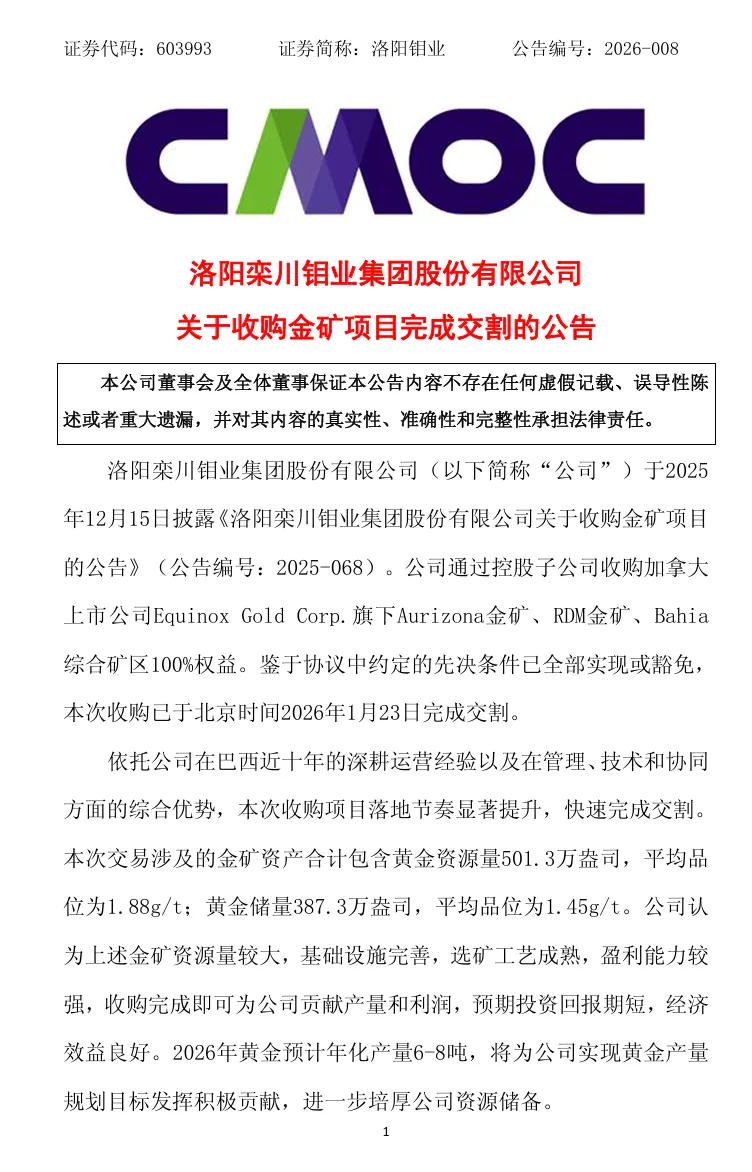 2026年1月25日晚,洛阳栾川钼业集团股份有限公司发布公告,宣布公司通过控股子公司完成对加拿大上市公司Equinox Gold Corp.旗下位于巴西的三座金矿资产的收购。