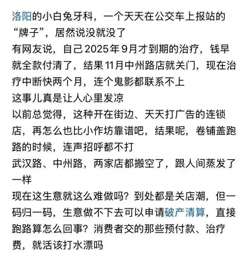 说到小白兔牙科中州国际店,这家算是当地挺有人气的口腔连锁。到了11月底,大家还以为能定好下一次复诊,结果门一关,卷帘门拉下,没人通知,连公告也没有。武汉路分店也是说搬就搬,现场早就人去楼空。一些顾客,比如王女士,前脚才刚交完全套治疗费用,没想到两个月不到想复诊就联系不上了。打电话,发信息全都石沉大海,那些还在做治疗的人更是一头雾水,不知道怎么办才好。