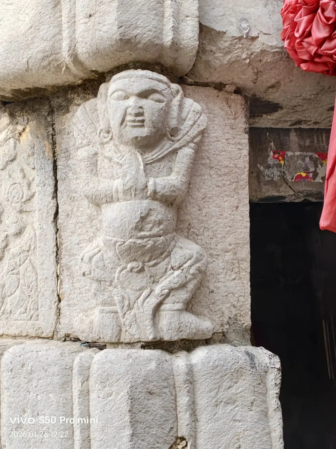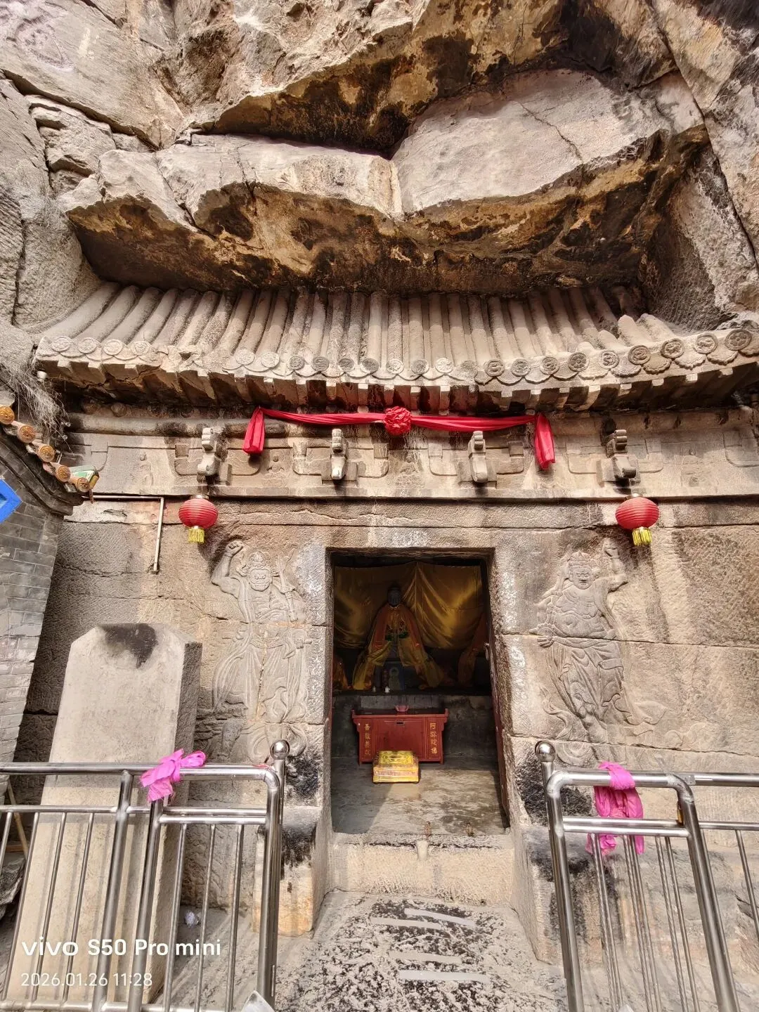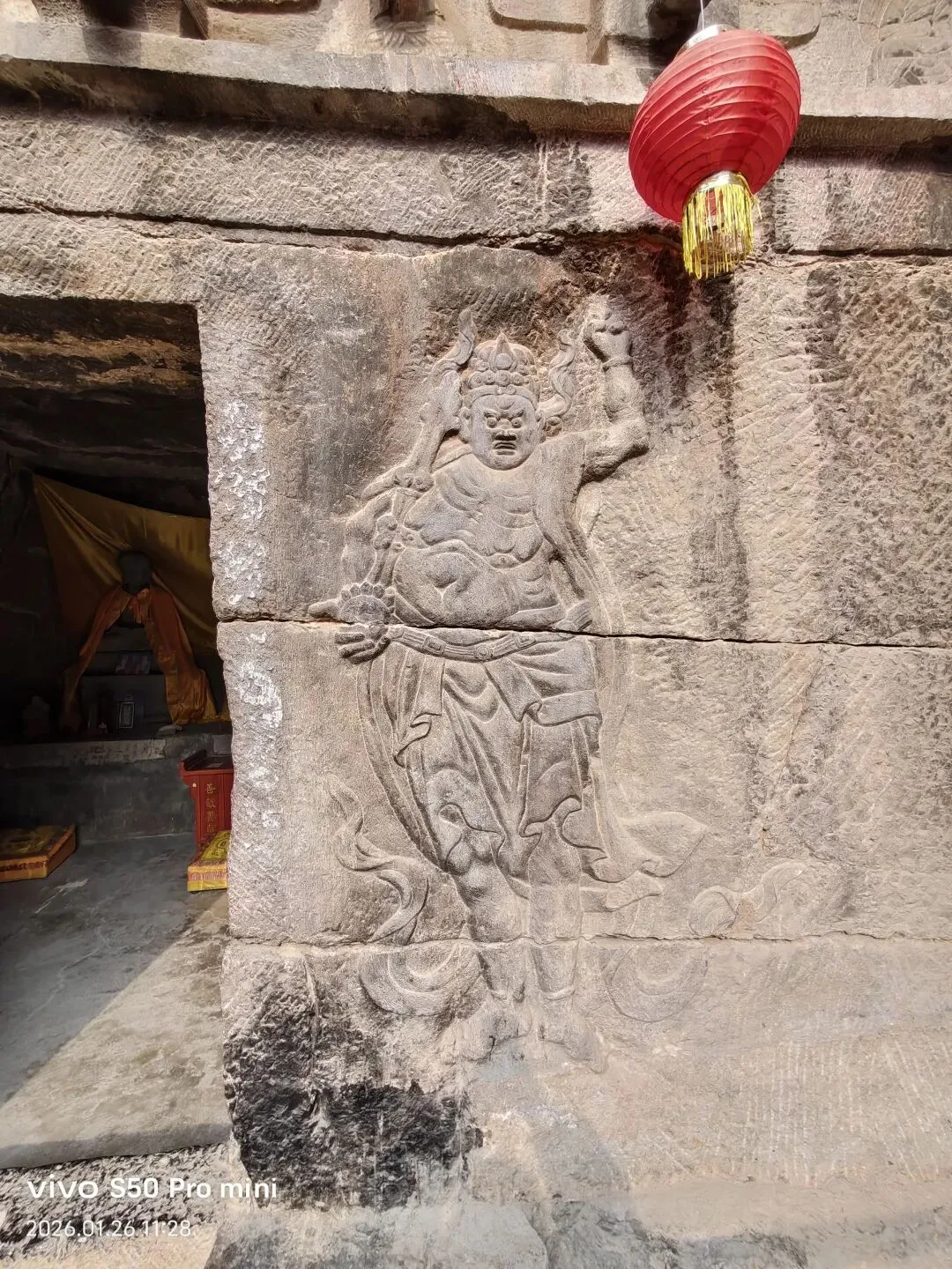 龙母殿为一座依托山壁开凿的石窟,坐北面南,仿木结构。窟门外两侧浮雕金刚力士,头戴宝冠、面部饱满,虽为明清作品,但姿态挺拔,不失为佳作。