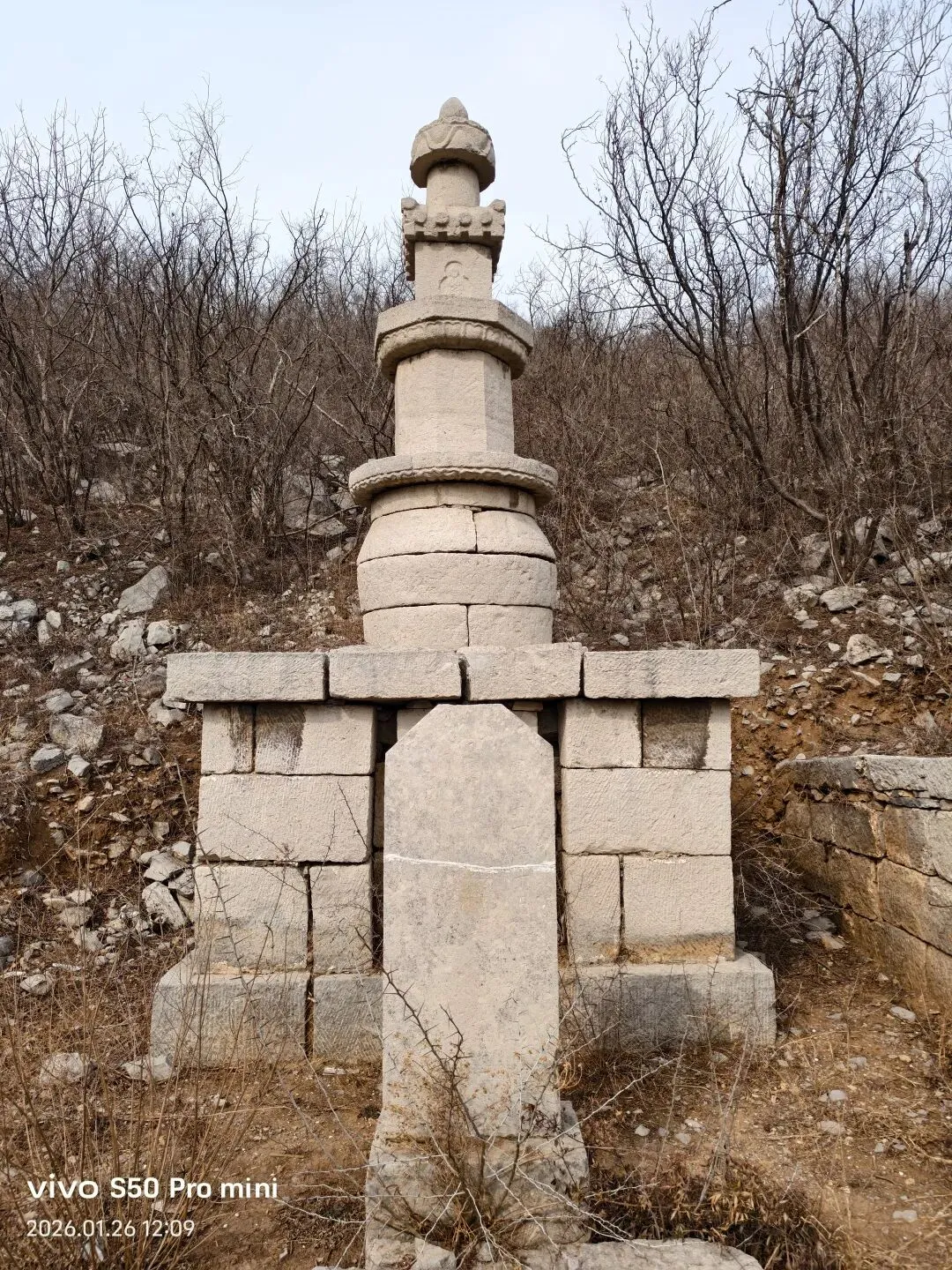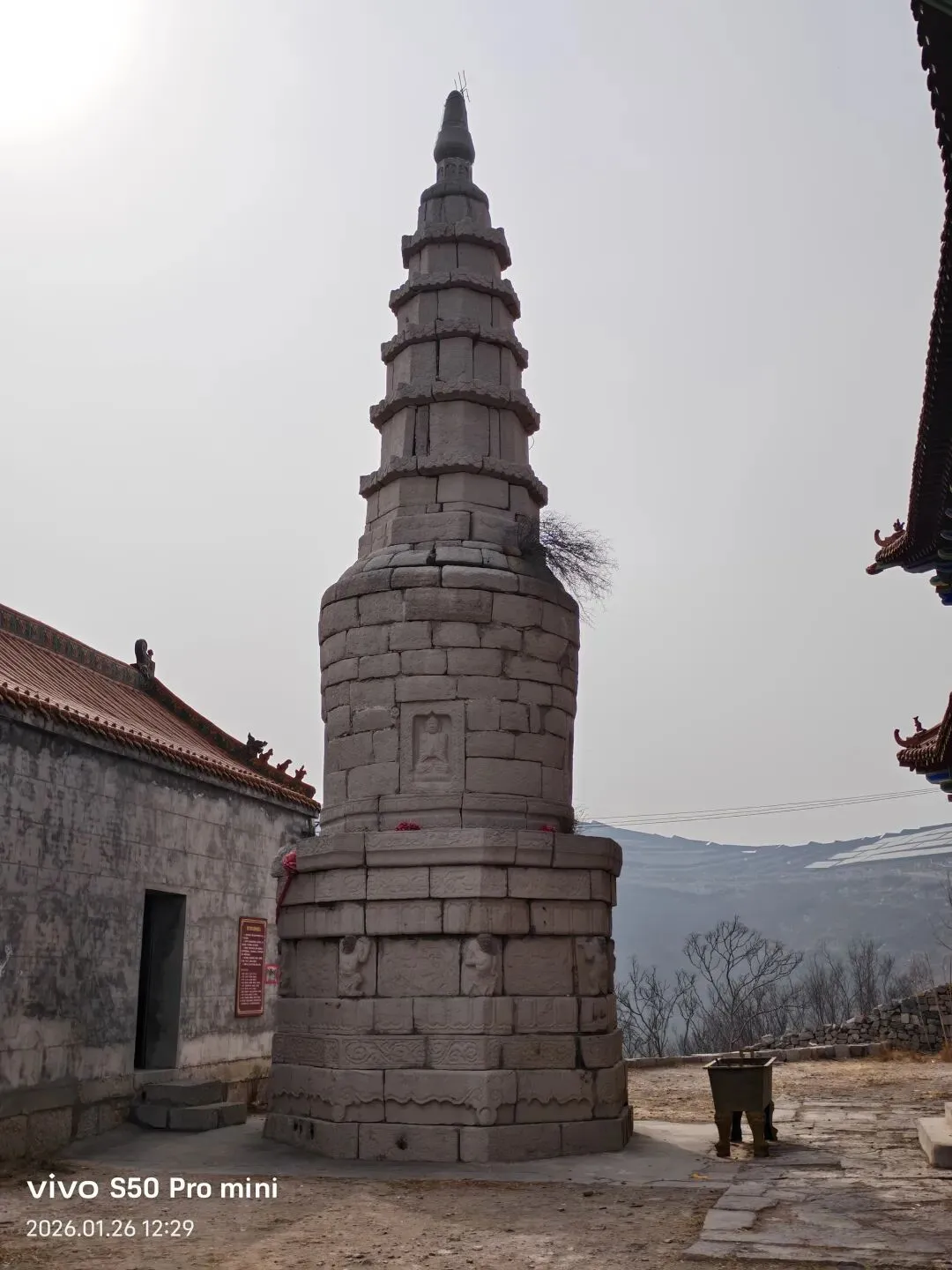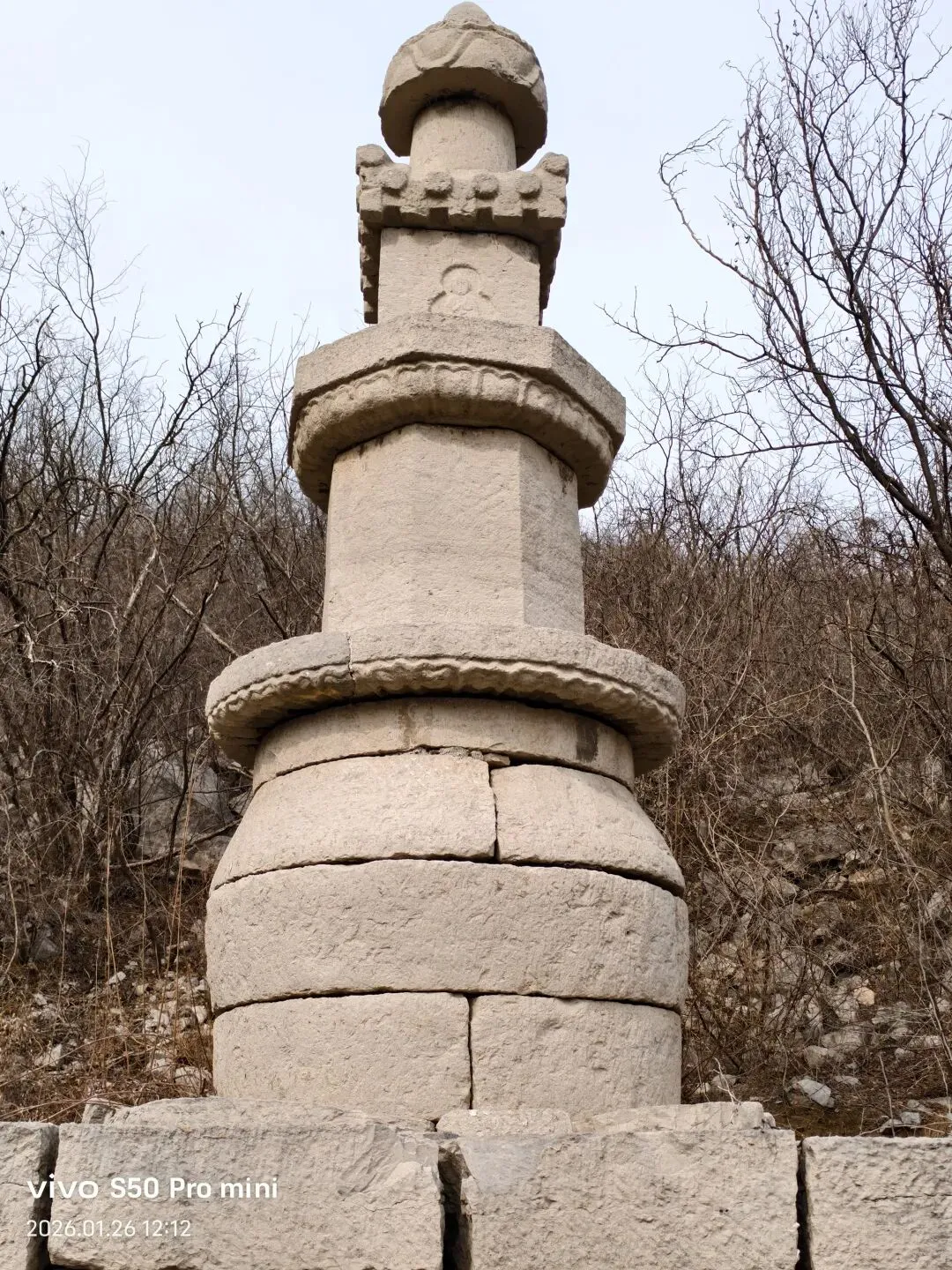 一间小石屋内,墙壁上的壁画,十八罗汉,形象逼真,人物神情饱满。可惜人为的破坏严重!黄龙洞半山腰,仅存的两座灰身塔;从模糊碑文记载为清代。登上山顶 ,进入眼帘的是座八宝塔,创建于明代。覆钵式石塔,高10米。下为汉白玉八角形须弥座,镌刻金刚力士、花卉图案。圆柱形塔身,南面辟门,内有石雕佛一尊。