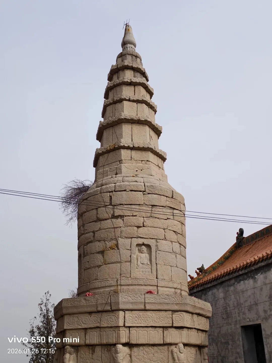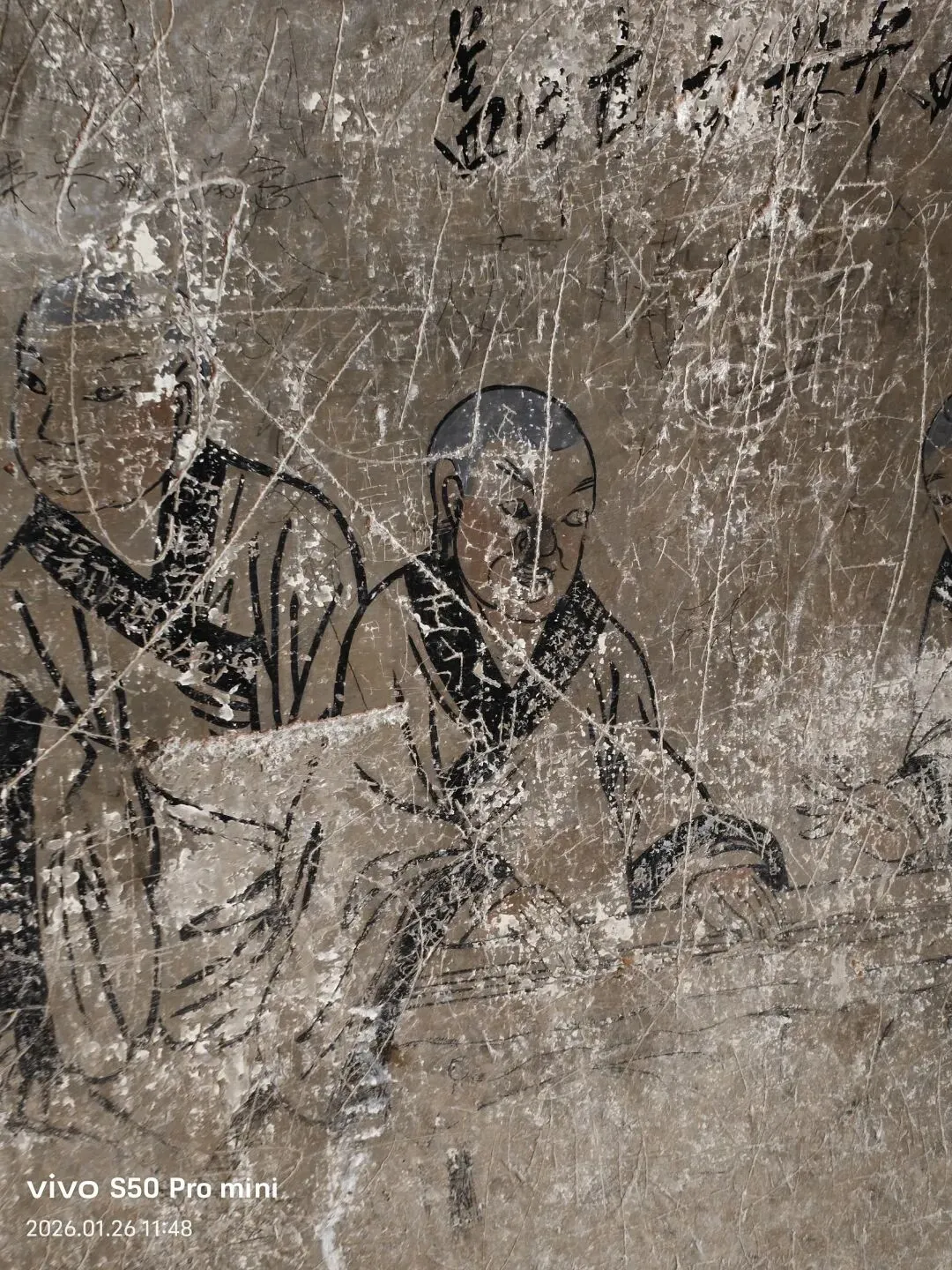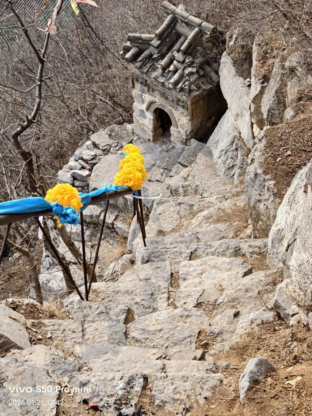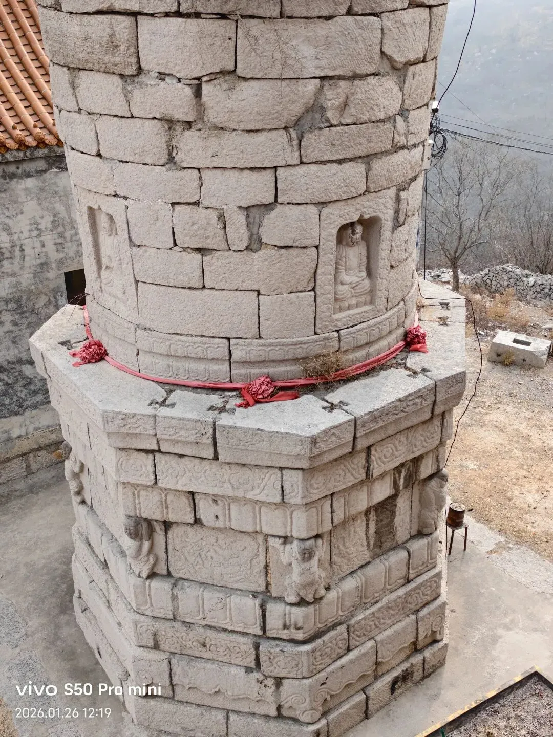 一间小石屋内,墙壁上的壁画,十八罗汉,形象逼真,人物神情饱满。可惜人为的破坏严重!黄龙洞半山腰,仅存的两座灰身塔;从模糊碑文记载为清代。登上山顶 ,进入眼帘的是座八宝塔,创建于明代。覆钵式石塔,高10米。下为汉白玉八角形须弥座,镌刻金刚力士、花卉图案。圆柱形塔身,南面辟门,内有石雕佛一尊。