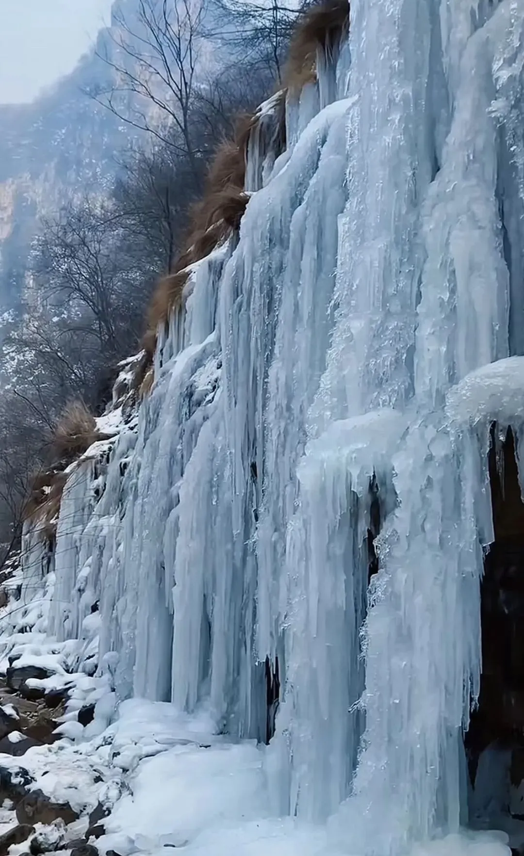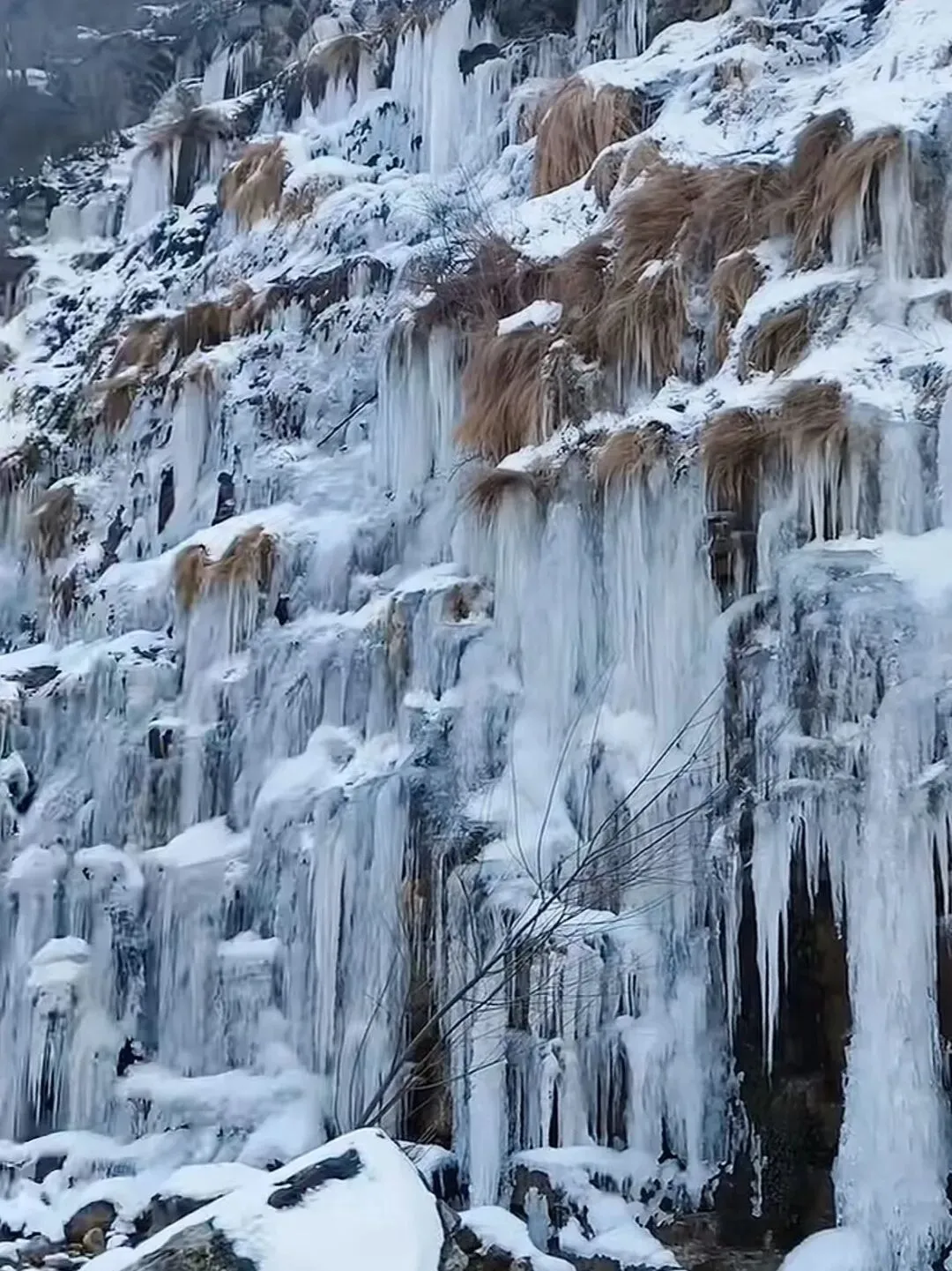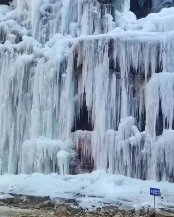 当温度骤降,蟒河口水库的水流从悬崖上滴落,逐渐形成了壮观的冰挂。这些冰挂形态各异,有的如钟乳石般垂下,有的如利剑般直指地面,有的如水晶般晶莹剔透,仿佛是大自然精心雕琢的艺术品。