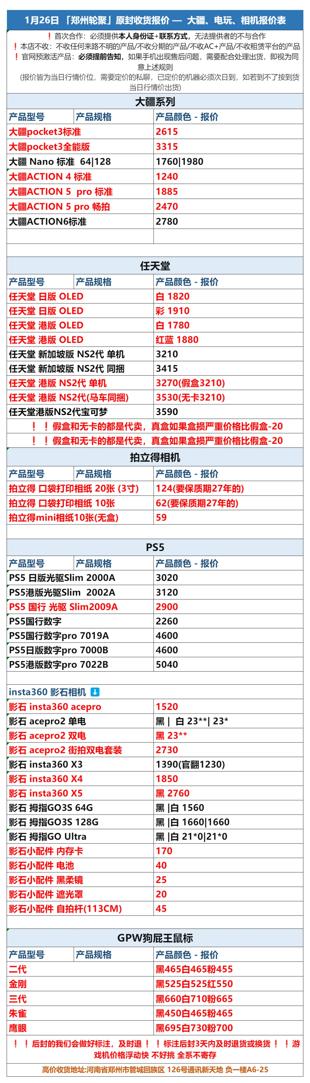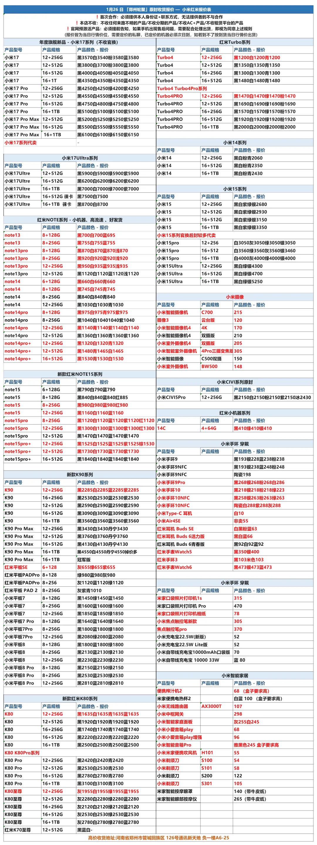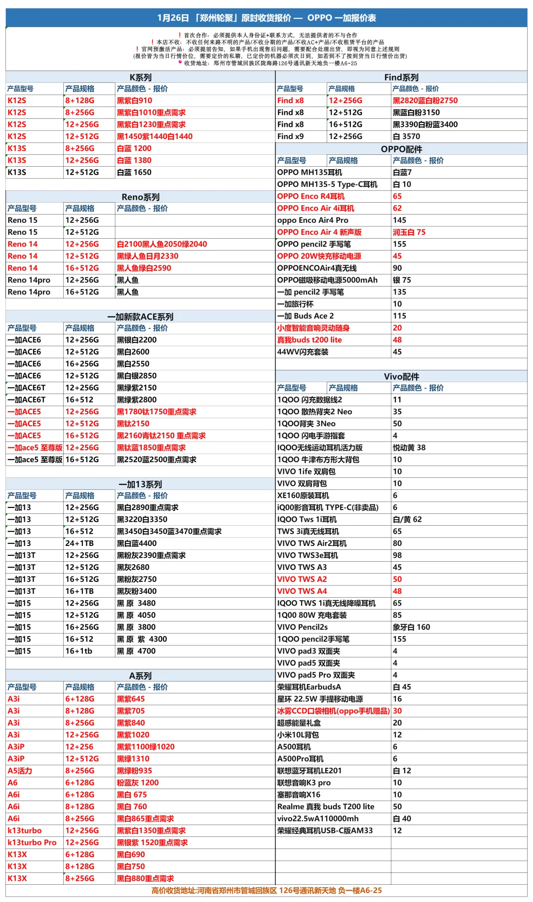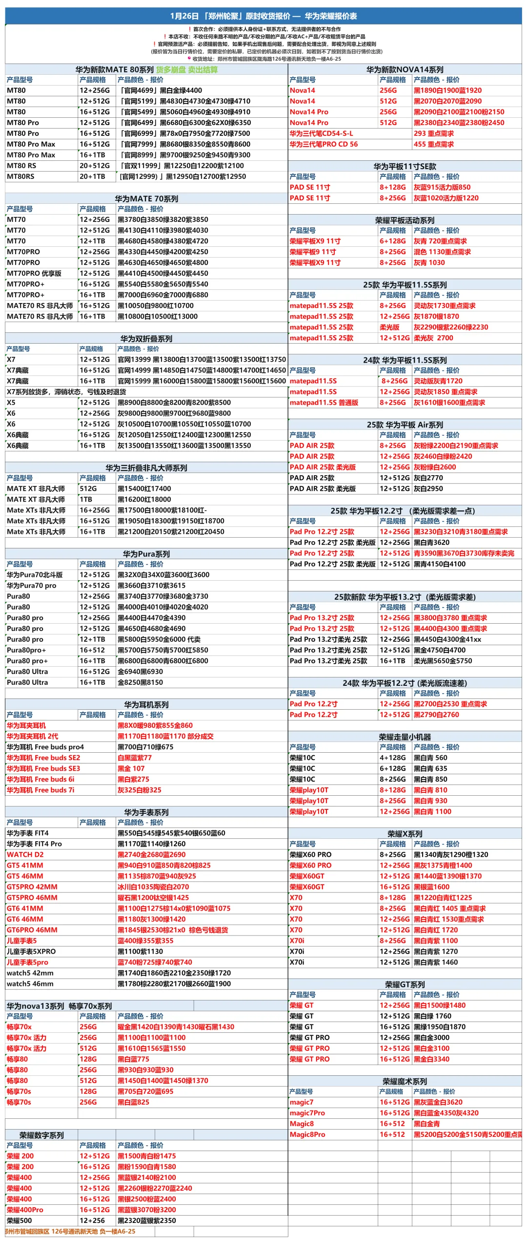 郑州轮聚通讯 2026年1.26日数码报价更新