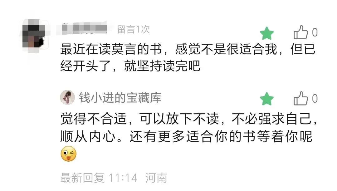 我经历过很多次这样的时刻,以前的我,也是这样要求自己读完的。但其实,一年当中甚至几年当中,能有一本书对自己有用、有帮助就是很幸运的事。所以,遇到一本书,真的读的不是很舒服、读的不喜欢不习惯,也不必纠结不必遗憾。不喜欢就不读。要相信,有更好的书在等着你,就在前方,就应该把时间放在喜欢的事情上,读书也是。今日如此,新的一天,祝你开心快乐!明天想聊一聊书的类别,你都喜欢读哪一类的书呢?