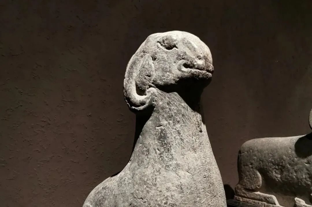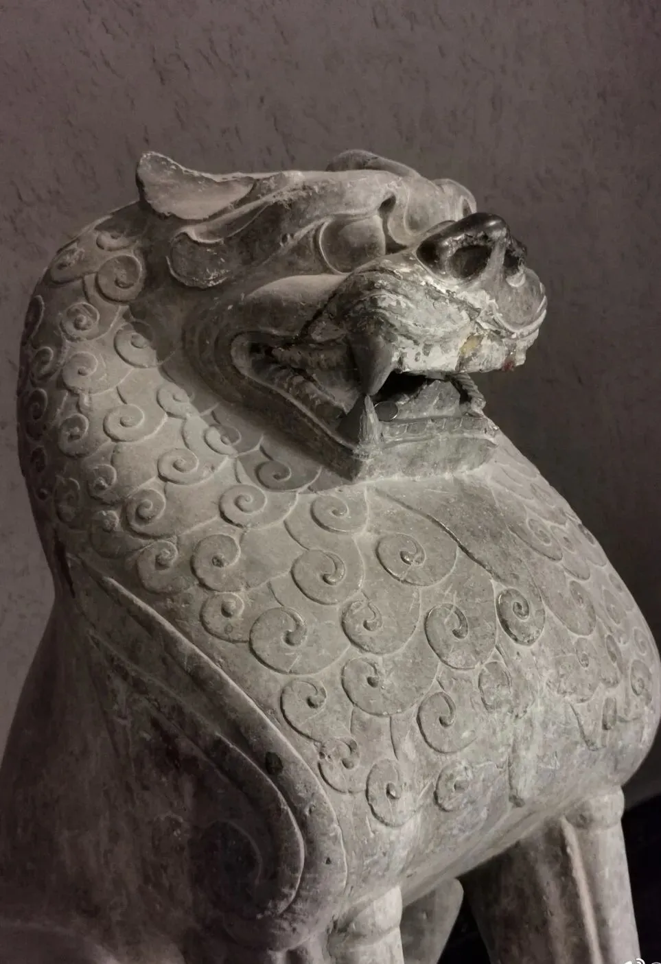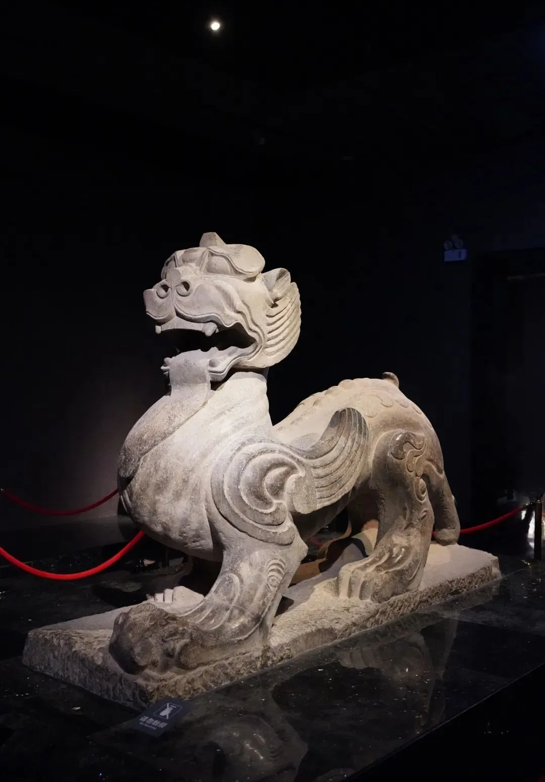 厅内的“镇厅之宝”当属东汉石辟邪,这尊石刻高约1.9 米,长约2.9米,以整块青石雕刻而成,体量雄浑壮观。辟邪昂首挺胸,四肢粗壮有力,双翼展开作腾飞之势,头部独角弯曲,双目圆睁,嘴部大张露出獠牙,既充满威慑力又不失灵动之气。