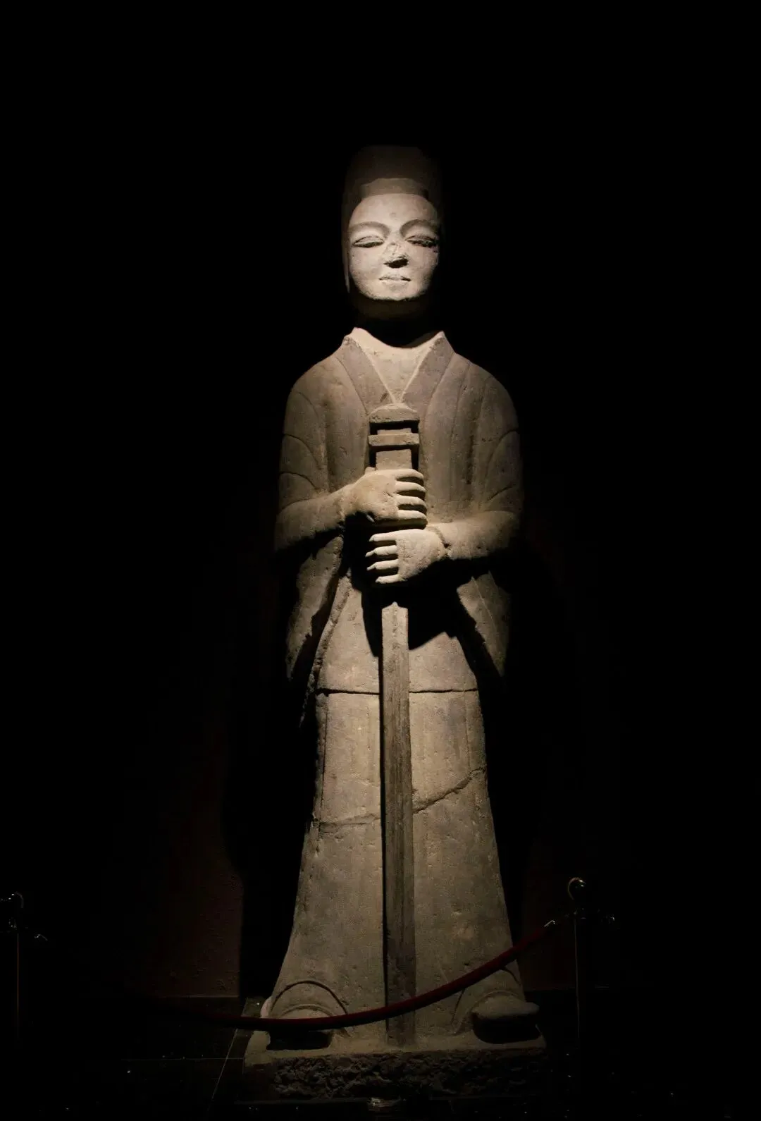 与之交相辉映的是北魏石翁仲,这尊石刻高约 2.3 米,为北魏皇室陵前的守卫石刻。石翁仲头戴官帽,身着宽袖朝服,双手执笏板于胸前,身姿挺拔直立,神态肃穆庄重。