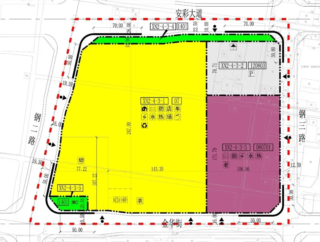 XN2-4-3-1地块为居住用地+老年人社会福利用地,该地块位于安阳市钢二路与安彩大道交叉口东南,建设规模为10.29公顷。图中黄色部分为居住用地,绿色部分为公园绿地,紫色部分为老年人社会福利用地,灰色部分为社会停车场用地。