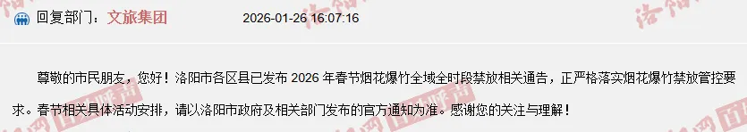 尊敬的市民朋友,您好!洛阳市各区县已发布 2026 年春节烟花爆竹全域全时段禁放相关通告,正严格落实烟花爆竹禁放管控要求。春节相关具体活动安排,请以洛阳市政府及相关部门发布的官方通知为准。感谢您的关注与理解!