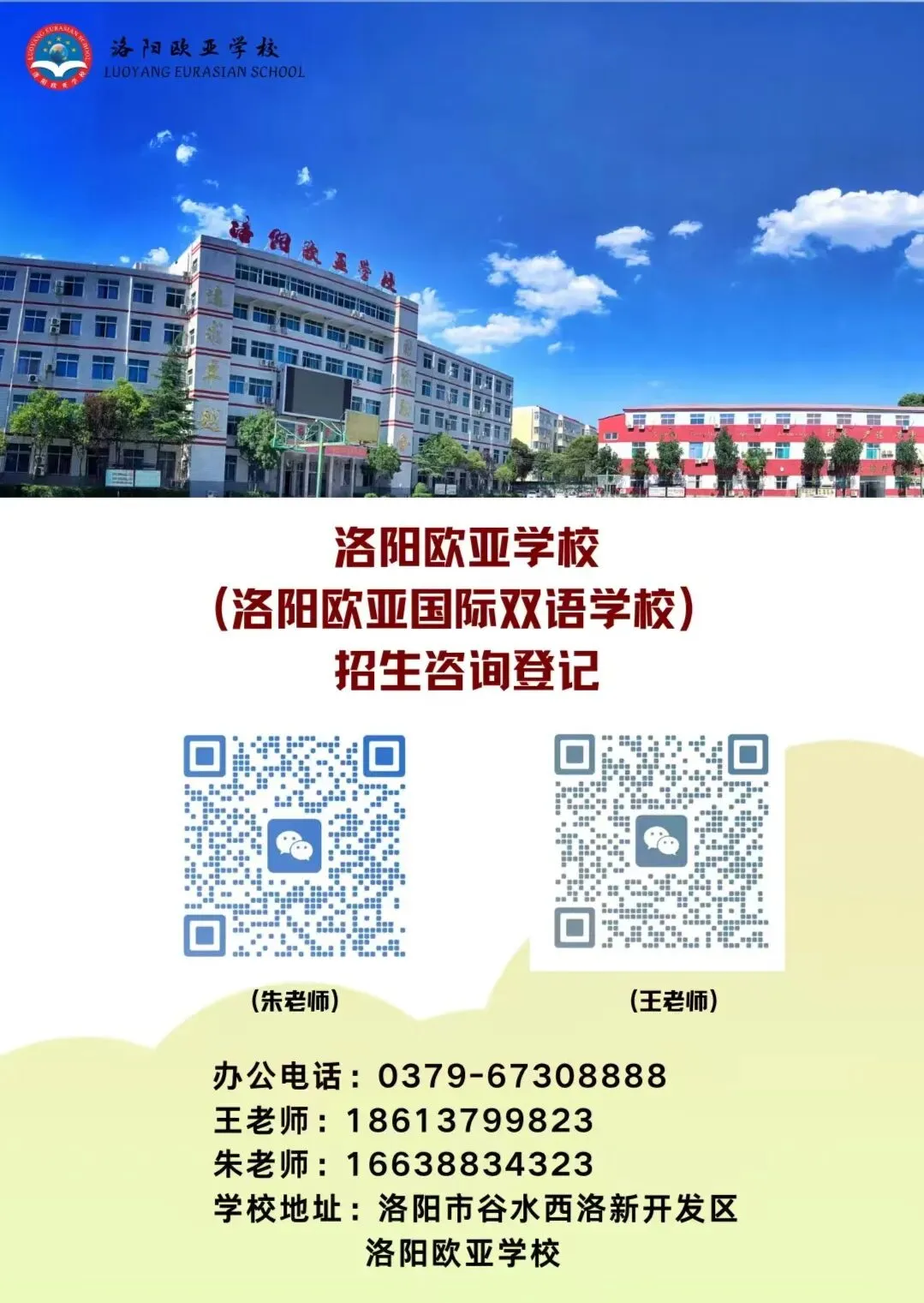 洛阳欧亚学校创建于2011年,是经河南省教育厅备案、洛阳市教育局批准成立的一所十二年一贯制全日制寄宿学校。学校位于洛阳市谷水西洛新产业集聚区,占地面积80亩,建筑面积64800平方米。现有在校学生2600余人,教职工238人。内设小学部、初中部、普通高中部、艺体高中部、武术部等。学校环境优雅,设施齐全,是一所高规格、高品位的花园式现代化学校。