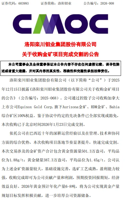 公告显示,洛阳钼业于2025年12月15日披露,计划以最高10.15亿美元收购加拿大Equinox Gold公司在巴西的Aurizona金矿、RDM金矿及Bahia综合体三项金矿资产(四座矿山)的100%权益。