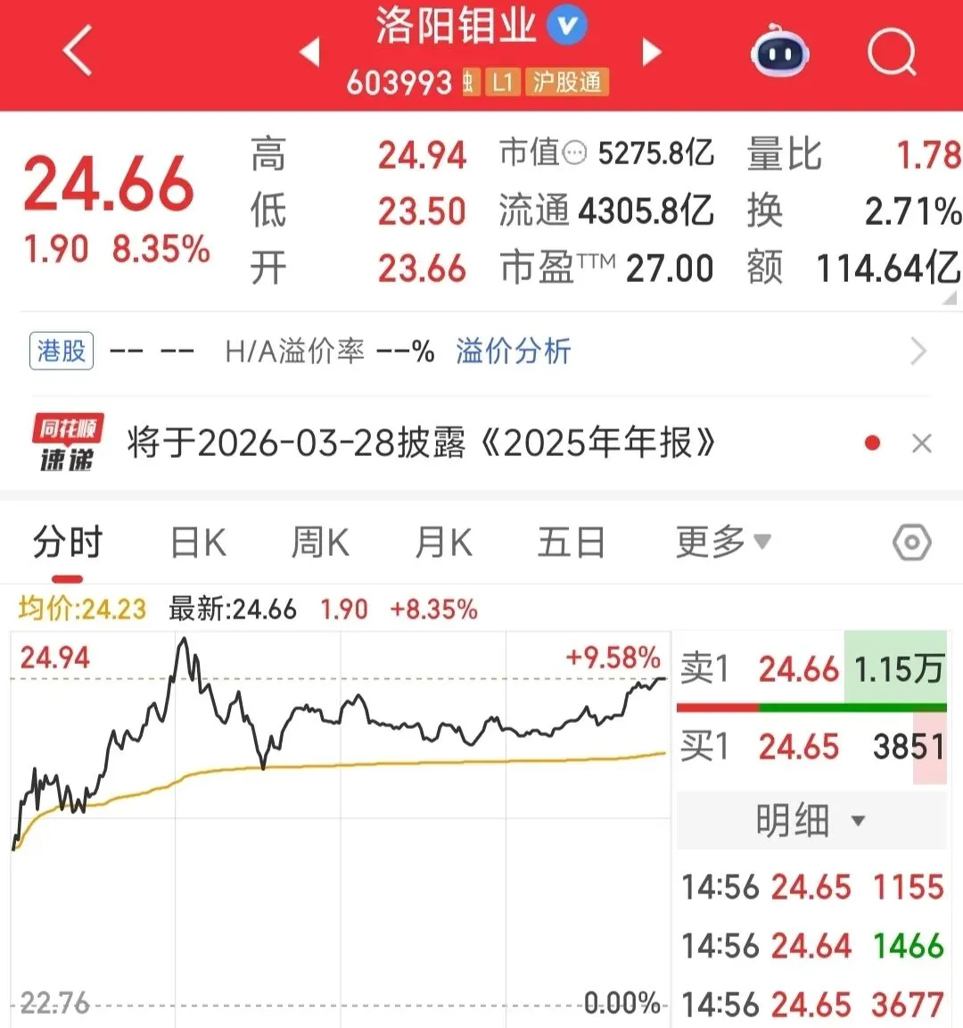 1月26日,洛阳钼业股价大涨8.35%,报收24.66元/股,市值为5275亿元。