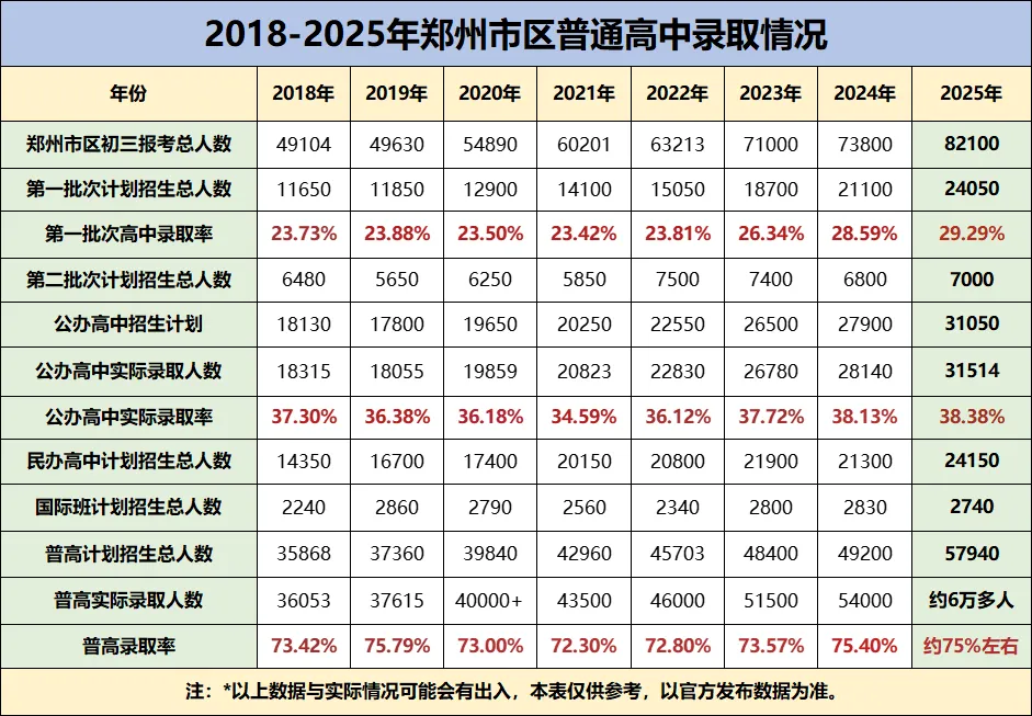 至于普通高中整体录取率,目前2025年官方未公布实际录取人数,暂未明确统计。但参考往年数据推测,2025年郑州普通高中录取率大概率维持在75%左右,据此逆推,今年普通高中实际录取人数约为6万余人。