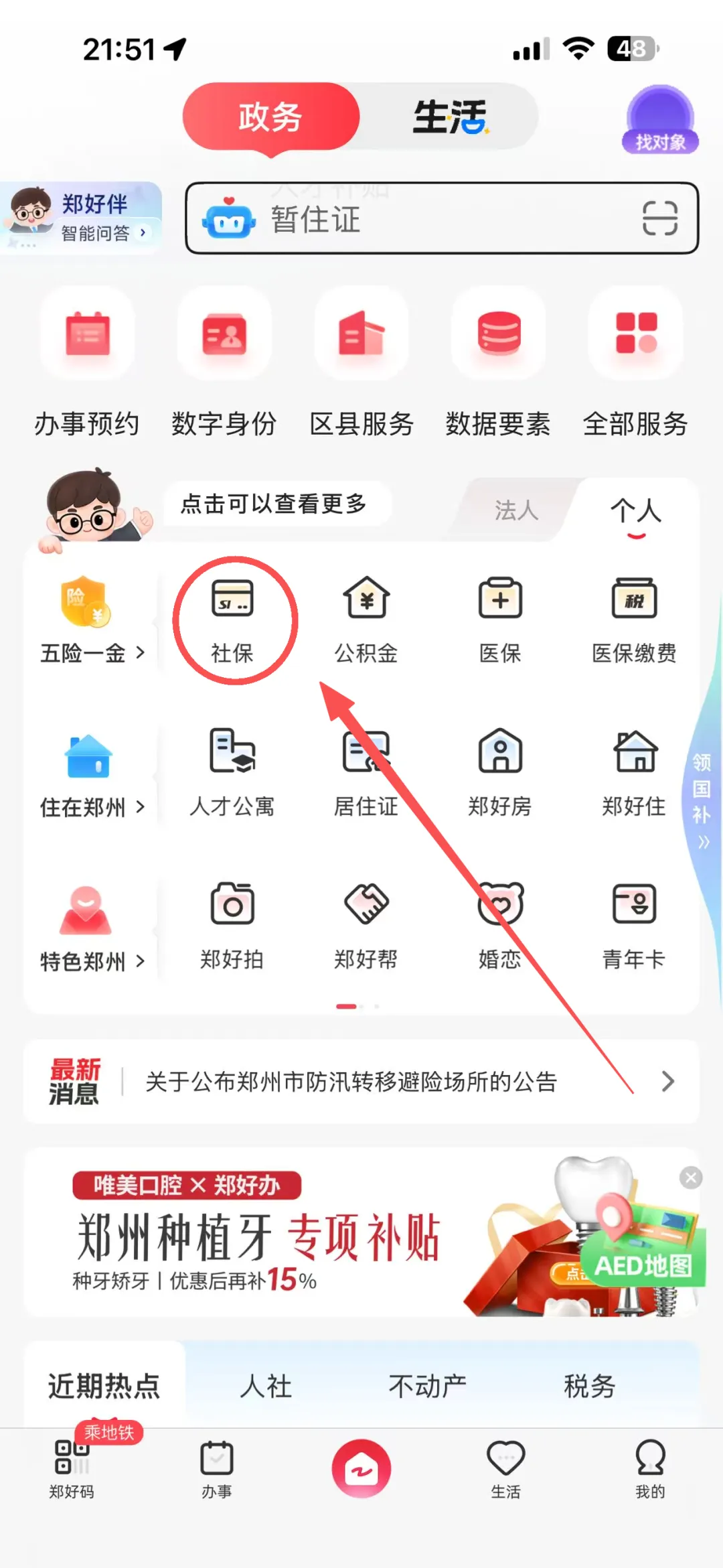 郑州市民可以通过“郑州人社·社保卡”微信公众号、“郑州市民卡”微信公众号、支付宝-城市服务、“郑好办”APP“一件事专区、”办理社保卡,以郑好办app为例:
