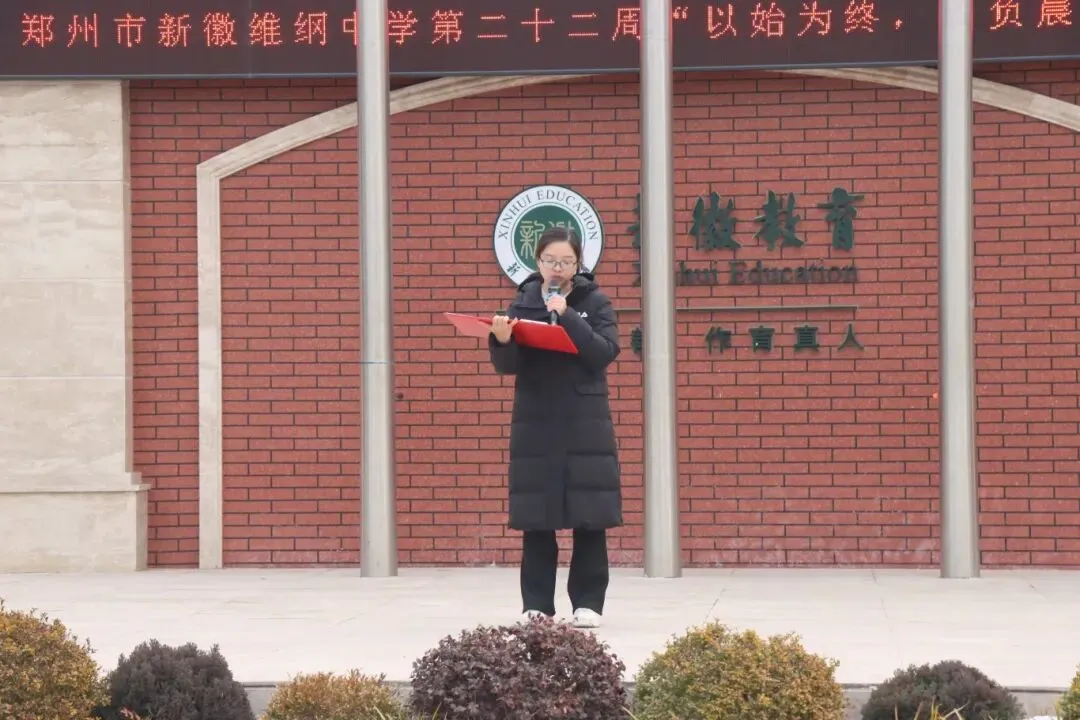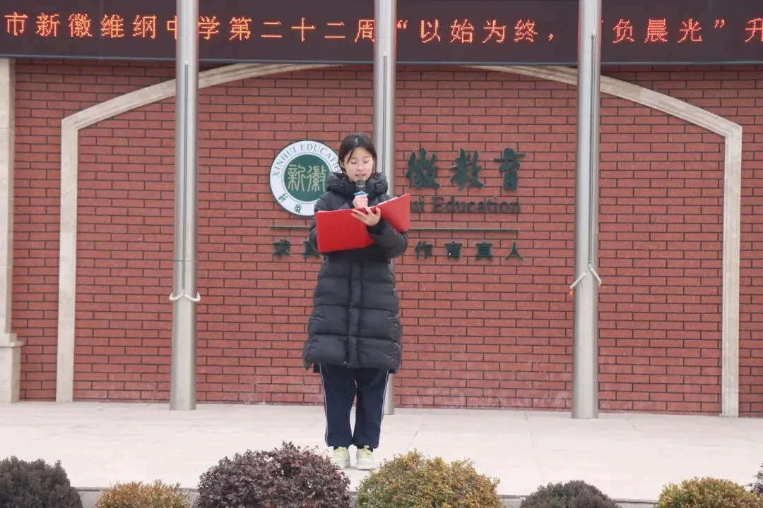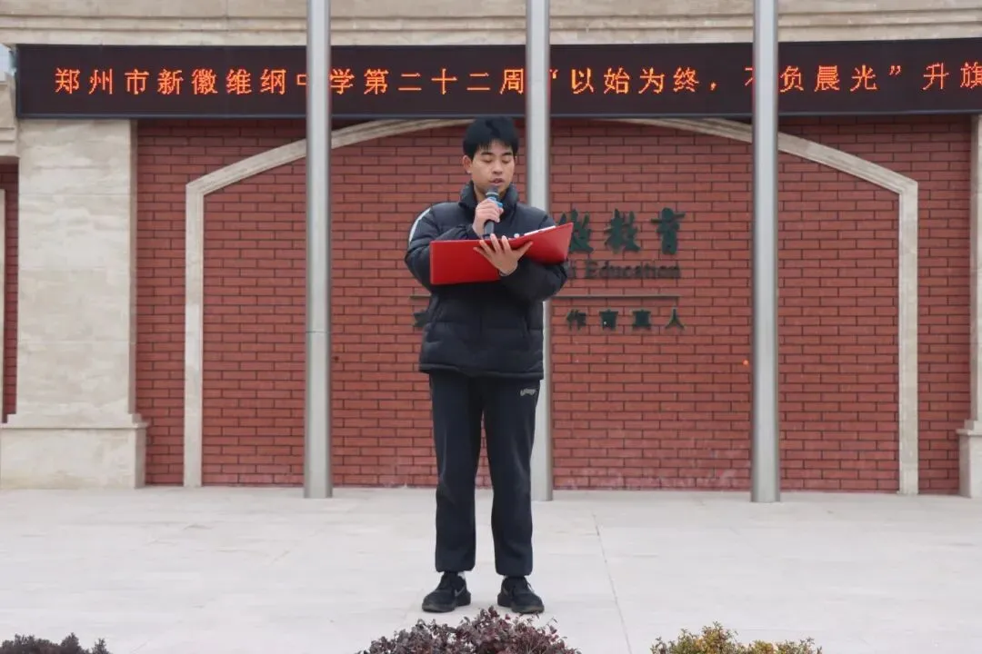 当熟悉的国歌声响起,我们的目光追随国旗一同攀升。此刻,我们站在这里,意味着新的一周即将开始,而随着时间流逝,本学期也即将结束,在接下来为期一周的在校时间里,想告诉大家一句话,珍惜光阴,以始为终,为自己的努力递上一份完美的答卷。