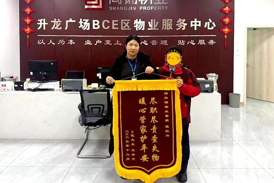 “手机里全是重要信息和支付软件,丢了真的要崩溃了!多亏了管家陈红丹,不然我真不知道该怎么办!”2025年12月26日,洛阳升龙广场 B 区业主王女士怀着激动的心情,将一面锦旗送到了物业服务中心,只为感谢管家在关键时刻的热心帮助。