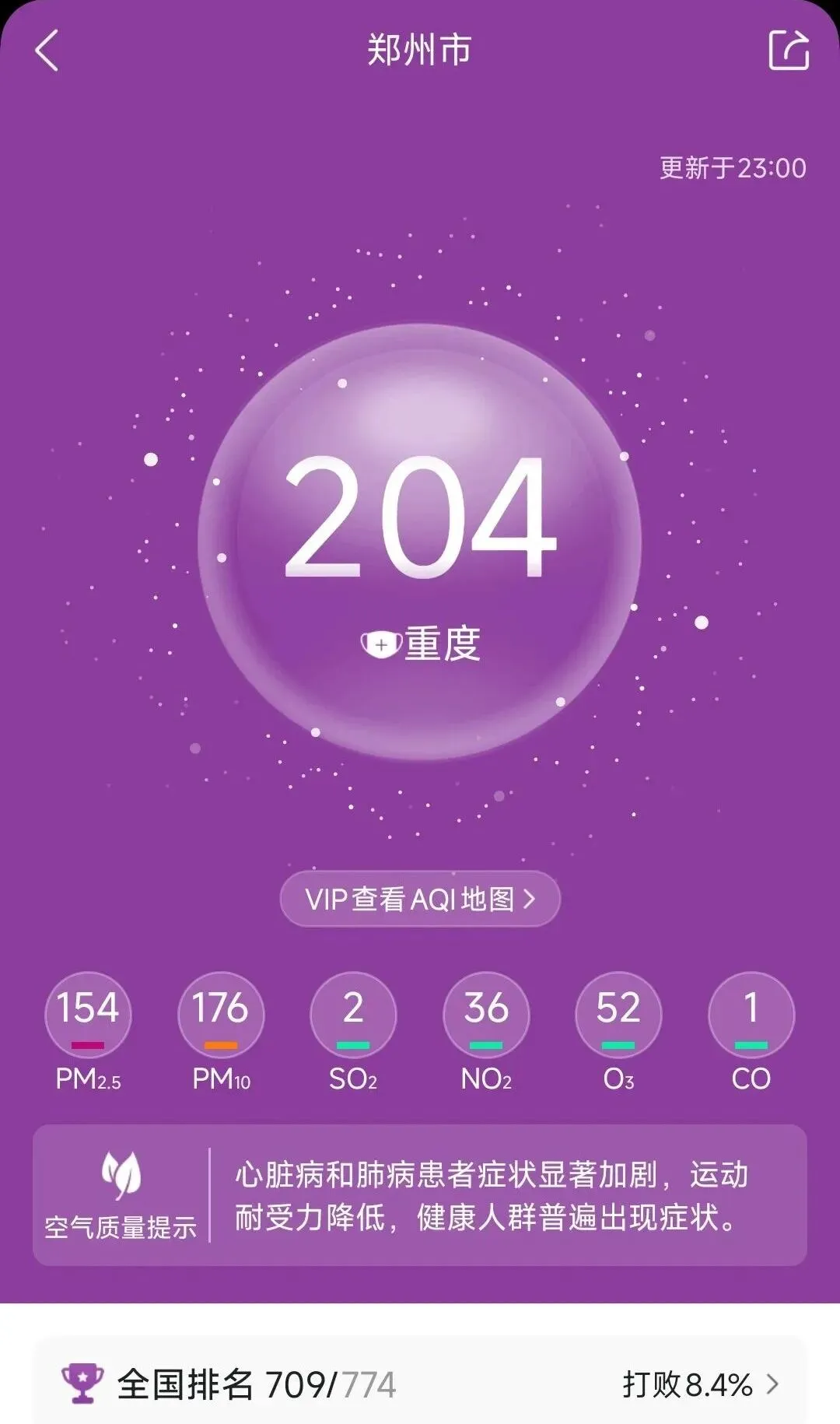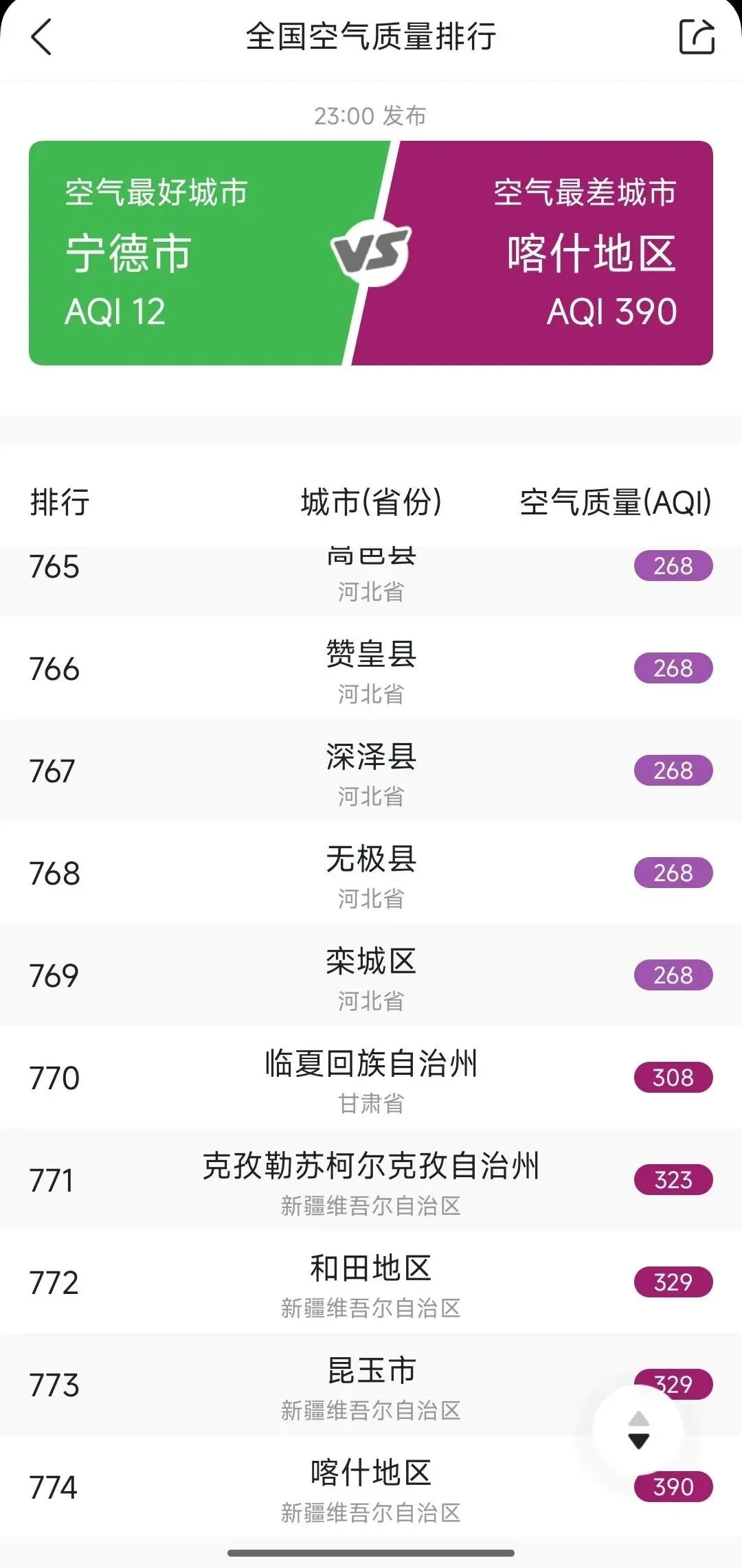 从手机软件上看到的还有一个信息,后几名的是新疆再有就是河北省,都比河南省的空气质量差。