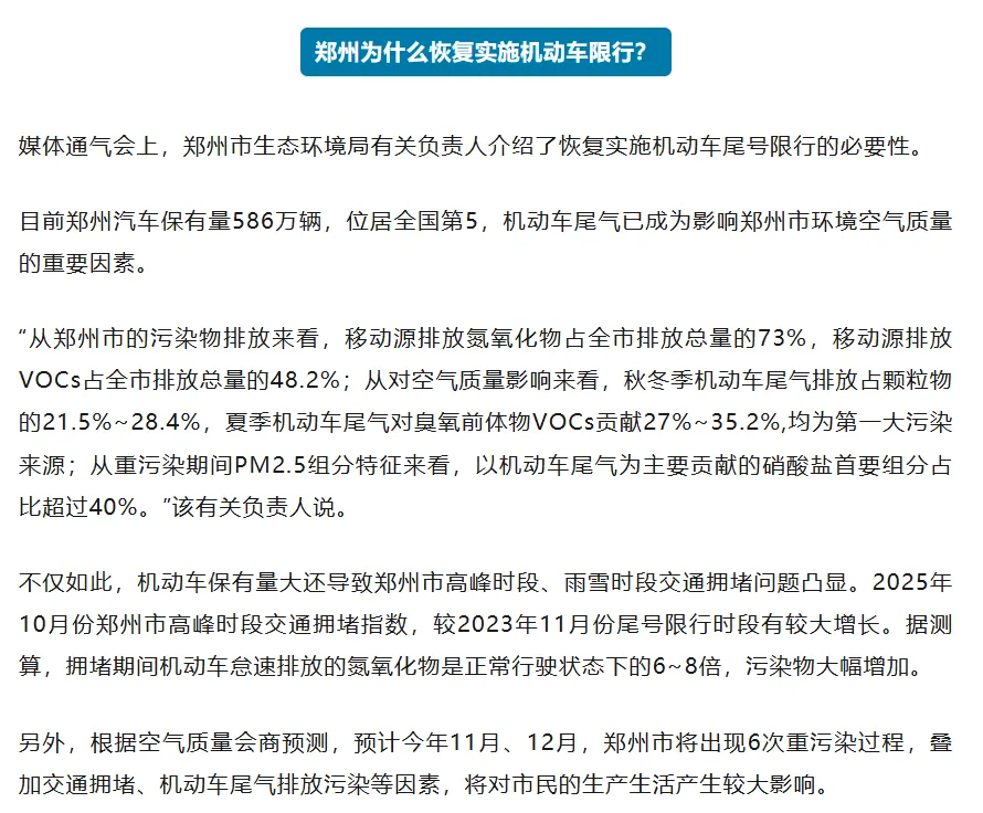 文章指出:媒体通气会上,郑州市生态环境局有关负责人介绍了恢复实施机动车尾号限行的必要性。目前郑州汽车保有量586万辆,位居全国第5,机动车尾气已成为影响郑州市环境空气质量的重要因素。从对空气质量影响来看,秋冬季机动车尾气排放占颗粒物的21.5%~28.4%,夏季机动车尾气对臭氧前体物VOCs贡献27%~35.2%,均为第一大污染来源;从重污染期间PM2.5组分特征来看,以机动车尾气为主要贡献的硝酸盐首要组分占比超过40%。”该有关负责人说。不仅如此,机动车保有量大还导致郑州市高峰时段、雨雪时段交通拥堵问题凸显。据测算,拥堵期间机动车怠速排放的氮氧化物是正常行驶状态下的6~8倍,污染物大幅增加。另外,根据空气质量会商预测,预计今年11月、12月,郑州市将出现6次重污染过程,叠加交通拥堵、机动车尾气排放污染等因素,将对市民的生产生活产生较大影响。