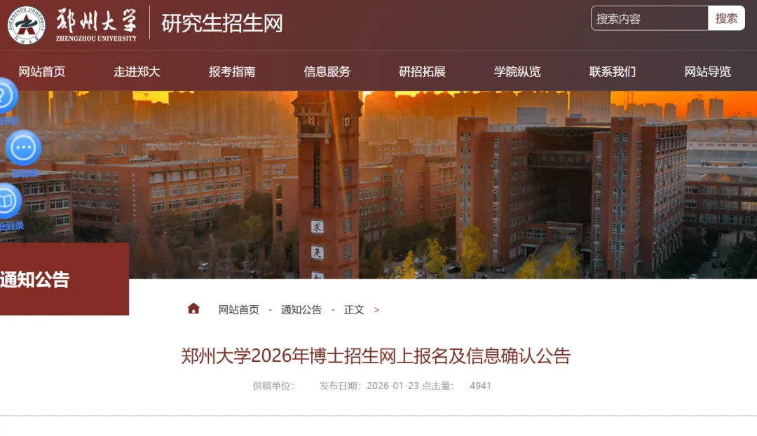 根据郑州大学2026年博士招生简章相关工作安排,现将本年度博士网上报名、缴费及信息确认具体工作及要求公告如下:
