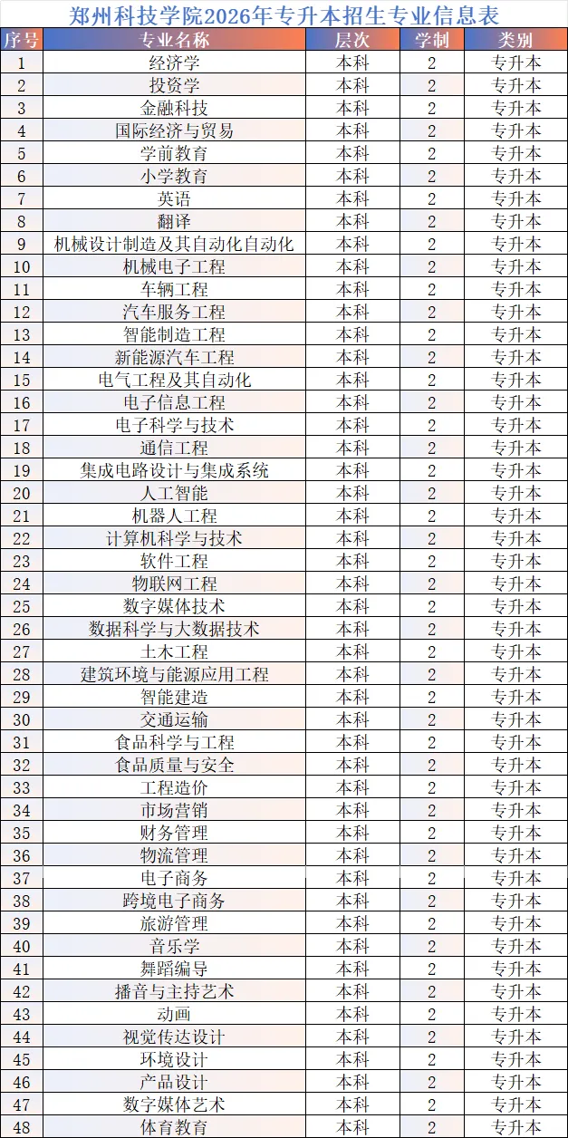 >郑州科技学院2026年专升本招生专业及近三年录取分数线