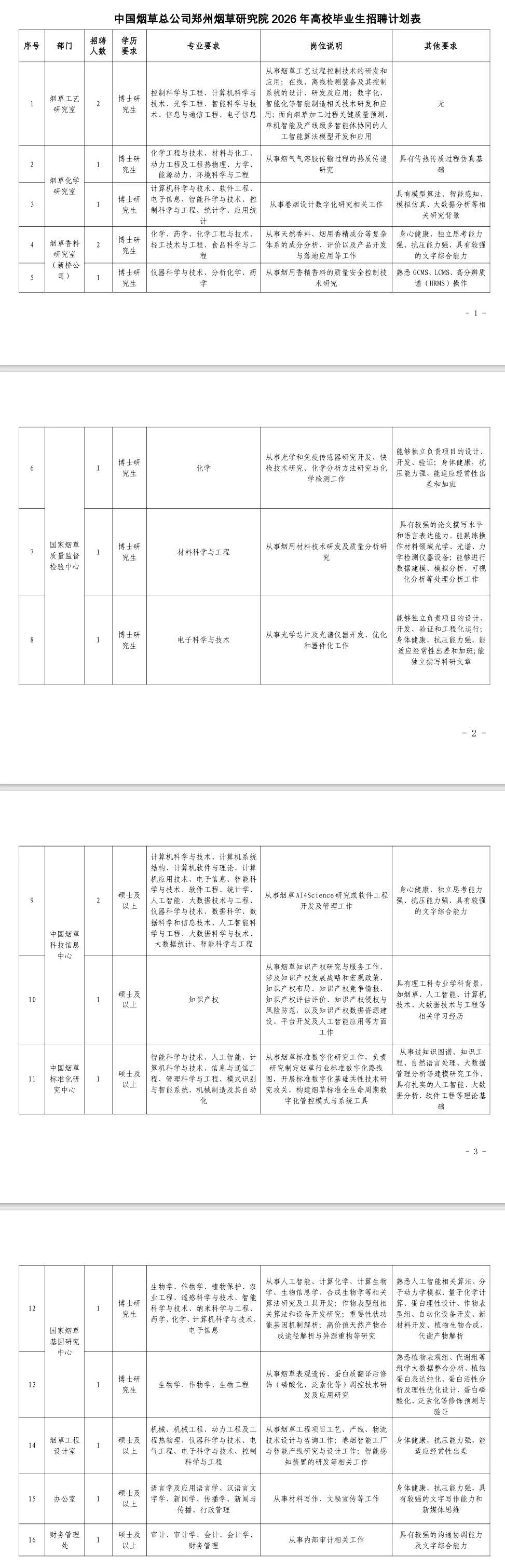 本次共招聘19人,招聘岗位、人数、专业及学历要求见《中国烟草总公司郑州烟草研究院2026年高校毕业生招聘计划表》(附件1)。