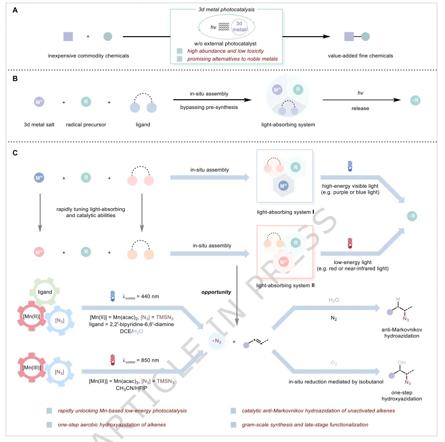 由易得组分(如金属盐、配体或底物)原位组装3d金属基光催化体系,是通过调节配体、抗衡离子或金属氧化态来控制吸光和催化性质的简便策略。这一范式避免了3d金属光催化剂的制备过程,有望实现从主流高能光氧化还原催化平台向低能平台的快速转变。