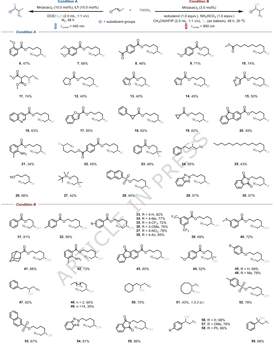 在本文中,作者证明了锰基光催化体系的原位组装是从高能可见光诱导的锰催化中快速解锁低能光氧化还原催化体系的有效策略。有价值的叠氮自由基的形成可通过低能近红外光(λ中心=850 nm)实现,而非依赖高能可见光(蓝光,λ中心=440 nm)。蓝光诱导的锰光催化体系可实现未活化烯烃以H₂O为氢源的反马氏自由基氢叠氮化反应,而锰基低能光催化平台可实现烯烃的好氧羟基叠氮化一步反应。这展示了原位组装锰基光催化的独特催化能力。
