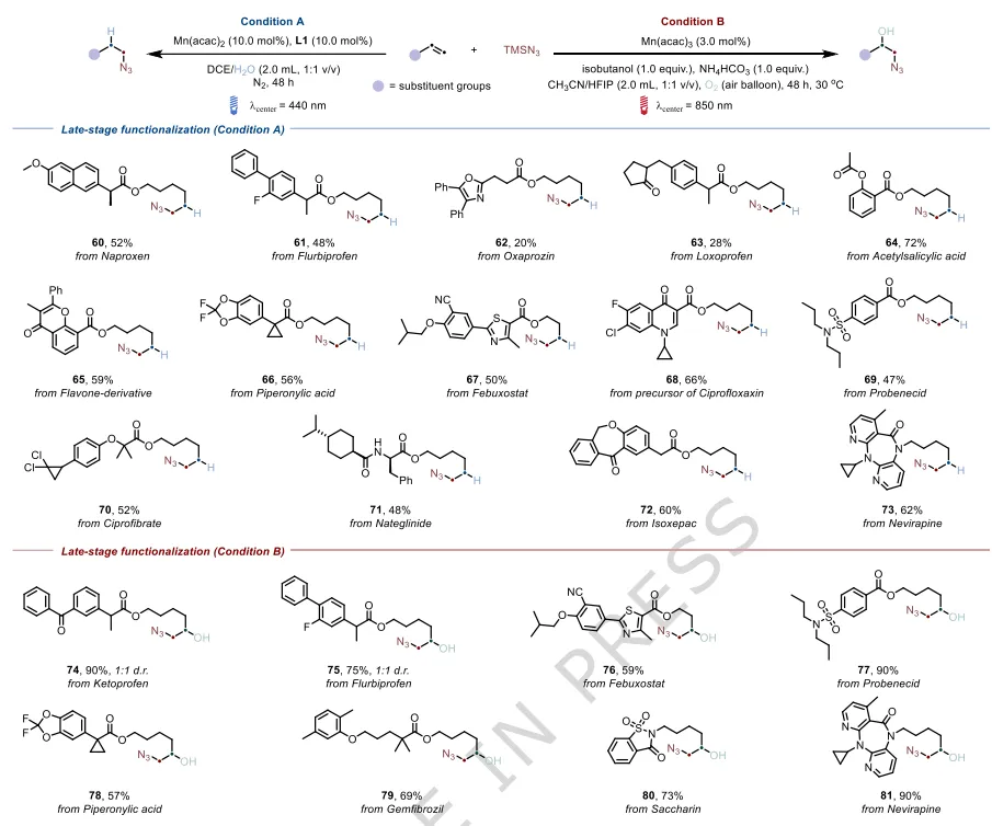 综上,作者证明了使用易得组分的模块化原位组装策略,能够从相应的高能可见光光催化快速解锁极具价值的锰基低能光氧化还原催化平台。锰基高能可见光光催化实现了未活化烯烃以H₂O为氢源的反马氏自由基氢叠氮化反应,而低能光氧化还原催化平台实现了烯烃的一步好氧羟基叠氮化反应。复杂分子的成功克级合成和后期官能团化,凸显了这两种锰基光催化体系的实际效用和广泛适用性。作者实验室仍在持续开展锰基低能光催化平台开发的进一步研究。