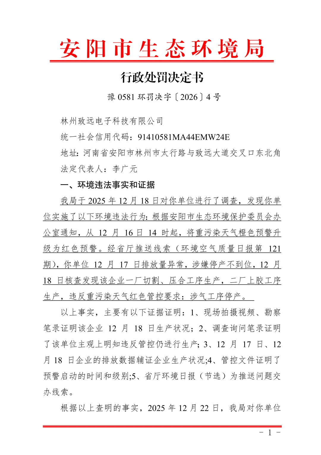 安阳市生态环境局林州分局行政处罚决定书