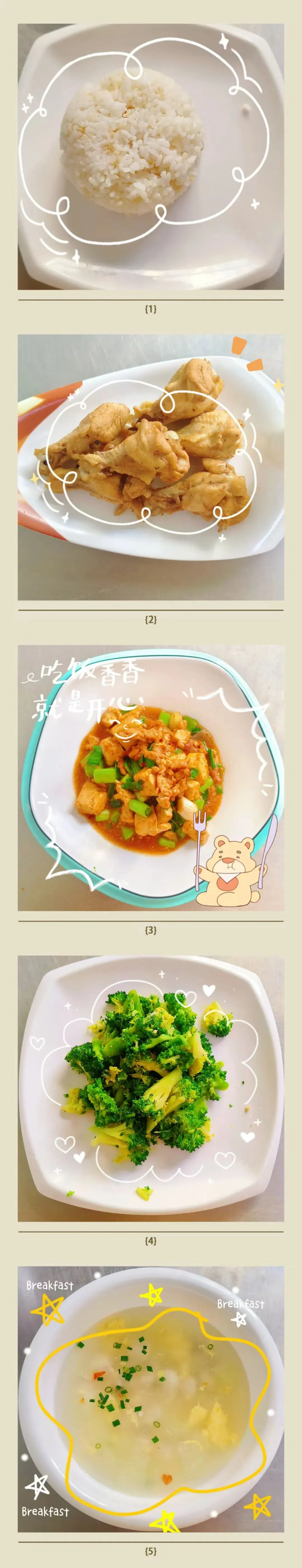 糙米饭 小鸡炖蘑菇 肉沫豆腐 清炒西兰花 冬瓜肉丸汤