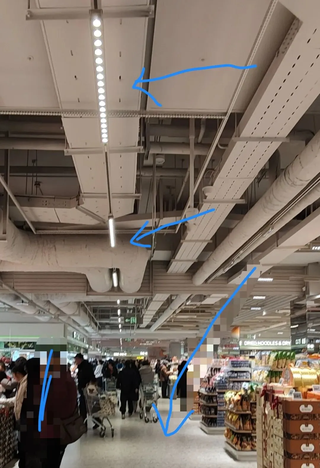 1,灯光既是氛围营造者,也是推动销售的无声力量。长申应该是用了当下最流行的偏光线型灯。以主通道以例,中午十二点十分,只有一排灯,光亮不足,见下图箭头处,地面有大片阴影。视觉很不舒服。为什么不采用双排?