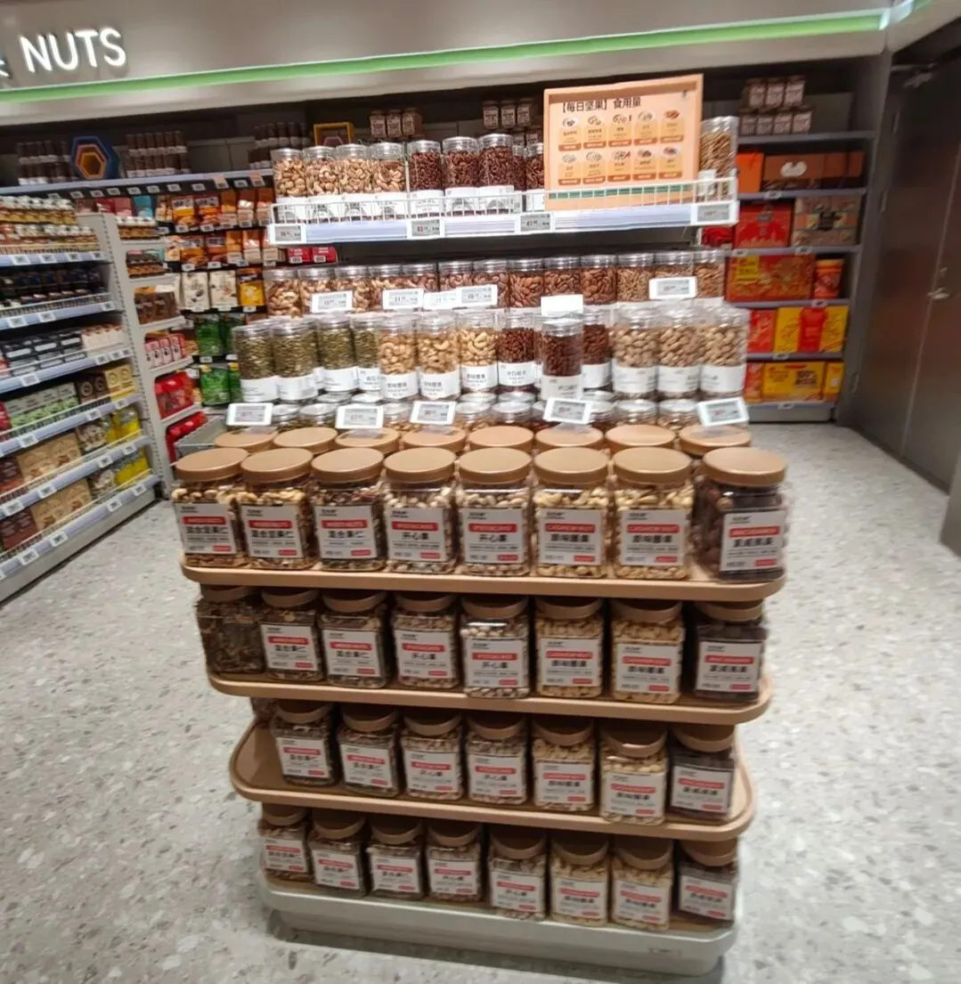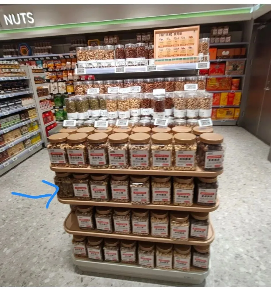 卖场里,除了促销能主动打招呼,理货员很少主动上前排忧解难,见下图右角,3个工作人员在一旁无所事事。 4,试营业期间,不知道是不是准备不足,长申员工工装就是一件没有任何大张标识的红马夹,带反光条。好难看,这难道是环卫工人工装吗?和涧西长申精品超市员工整齐好看的工装一比较,充满了乡土气息。 5,堆头货物摆放不整齐,见下图,咱从第二排从左数仔细看,第一个干果桶放反了,第5个明显比战友多站出了半个身位,第8个处在圆弧角上,其实8个干果可以整齐的靠在一起,第8个干果就不会歪着身子了。