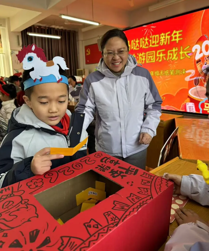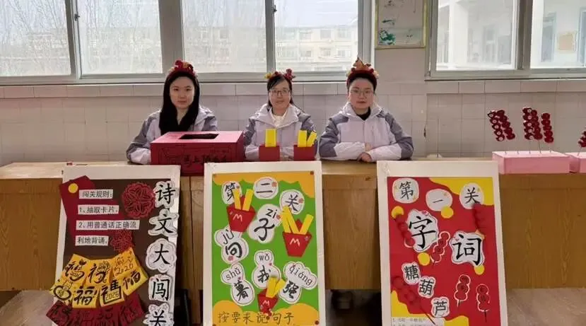 一、二年级的语文老师根据学生的年龄特点,结合本学期学习重点知识,设计了字词串串香、造句纳福袋、诗文大闯关三个关卡。综合评价学生对所学语文知识、技能的掌握程度,激发儿童潜能,激励学生成长,让孩子们在闯关游戏中享受成长的喜悦,收获成功的快乐。活动现场,孩子们化身朝气蓬勃的“小骏马”,手持专属闯关卡,兴致勃勃地穿梭于各个测评区域。他们或朗声诵读展字词功底,或巧思细说准确运用语言,成长的喜悦与新年的暖意交织相融,洒满校园的每一个角落。