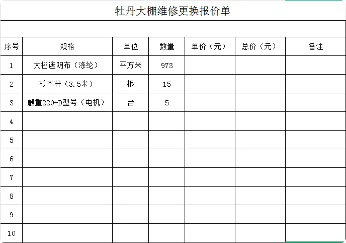 2.本次询价,涵盖牡丹地大棚相关设施更换维修项目:需更换涤纶遮阴布973平方米、3.5米长杉木杆15根(维修更换)、麒重220-D型号大棚电机5个,项目总控制价4.3万元。要求每个供应商仅提供一个报价,报价表一式一份(附报价单)。