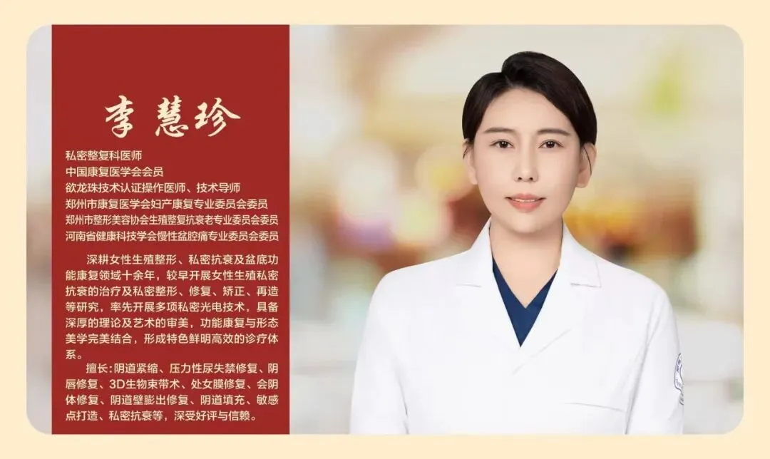 李慧珍医生专注女性私密整形与生殖抗衰多年,擅长结合激光、生物刺激与盆底康复技术,为女性量身打造自然、安全、长效的健康方案。她常说:“爱自己,从关注私密健康开始。”