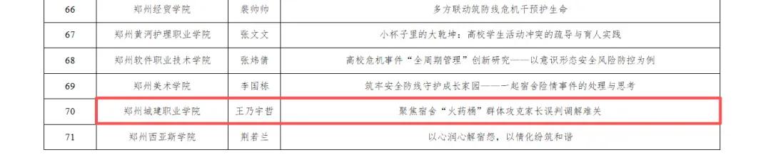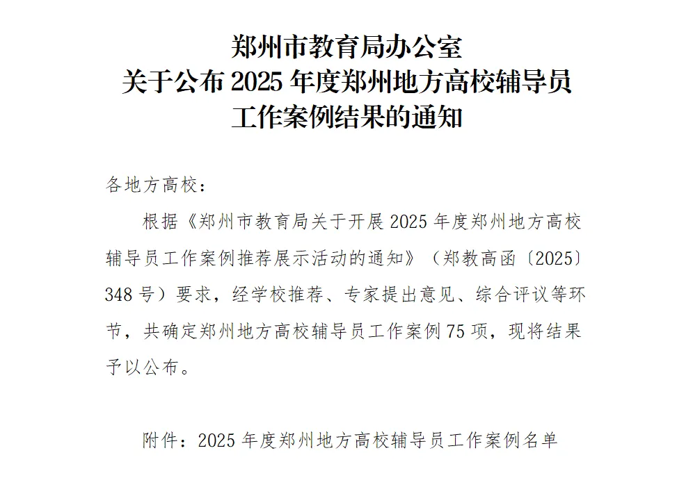 近日,郑州市教育局公布了2025年度郑州地方高校辅导员工作案例遴选结果。根据《郑州市教育局关于开展2025年度郑州地方高校辅导员工作案例推荐展示活动的通知》(郑教高函〔2025〕348号)要求,经学校推荐、专家评议、综合评审等环节,全市共确定辅导员工作案例75项。其中,我校物联科技学院辅导员王乃宇哲撰写的《聚焦宿舍“火药桶”群体攻克家长误判调解难关》成功入选。