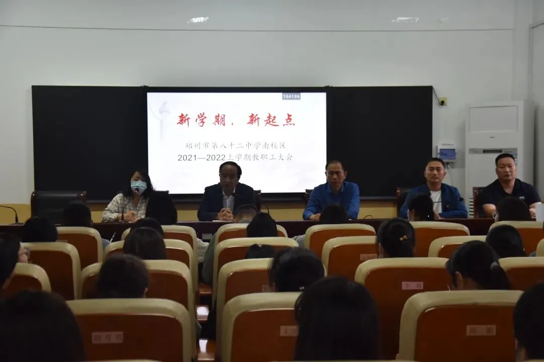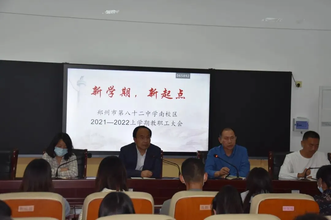2021年9月26日下午,郑州市第八十二中学南校区(郑州市第十三中学)于办公楼会议室召开了新学期第一次全体教工大会。郑州市第八十二中学集团校长何守刚、郑州市八十二中南校区党支部书记张英峰、正校级干部张长水、执行校长辛晚花、副校长闫小彪等领导班子参与会议。