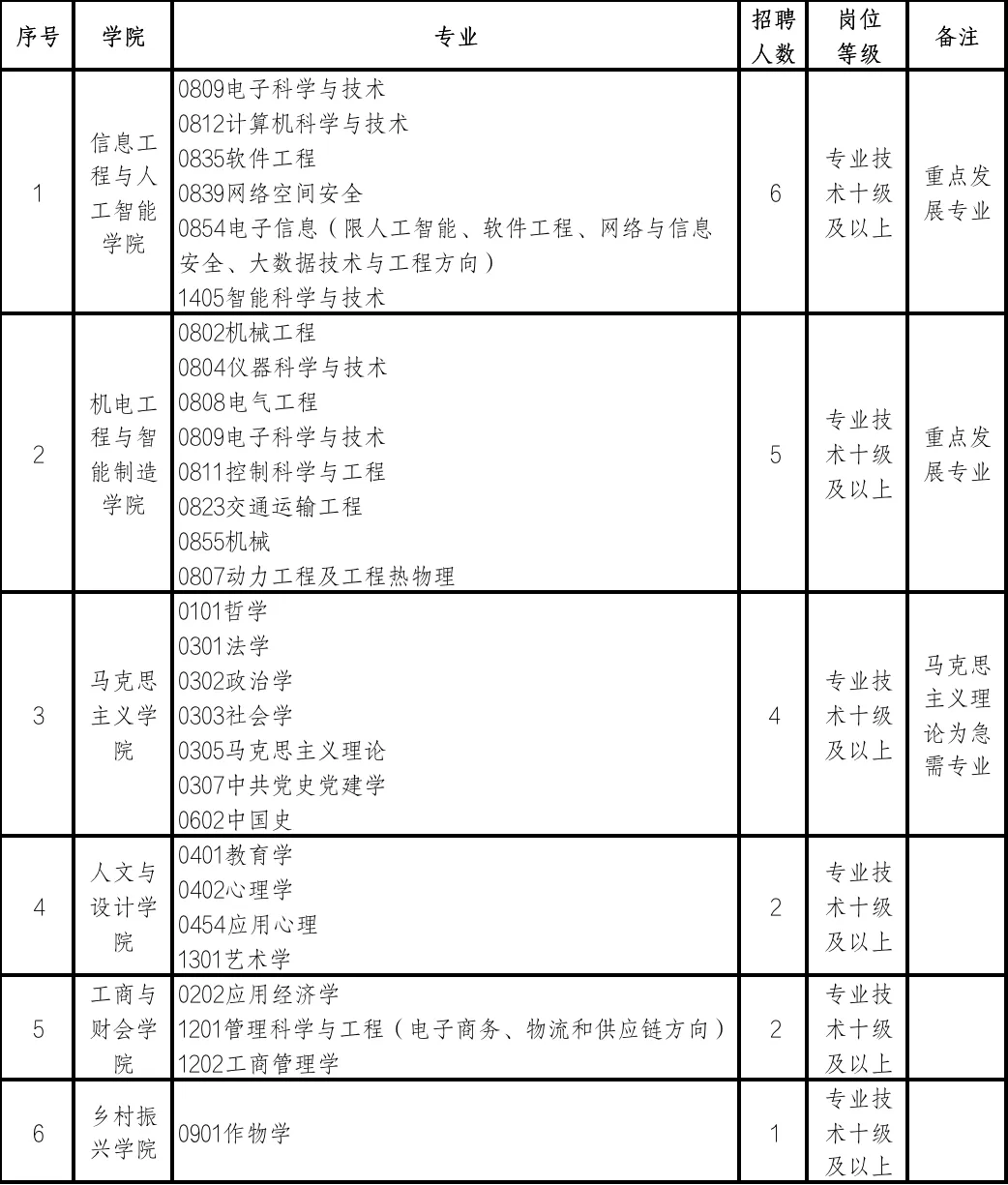 根据我校岗位空缺情况和事业发展需要,2026年拟公开招聘领军型人才、优秀博士、高技能人才、行业资深实践型人才20人。专业要求及人数见附件1,其他相关专业特别优秀的可与招聘管理人员联系。