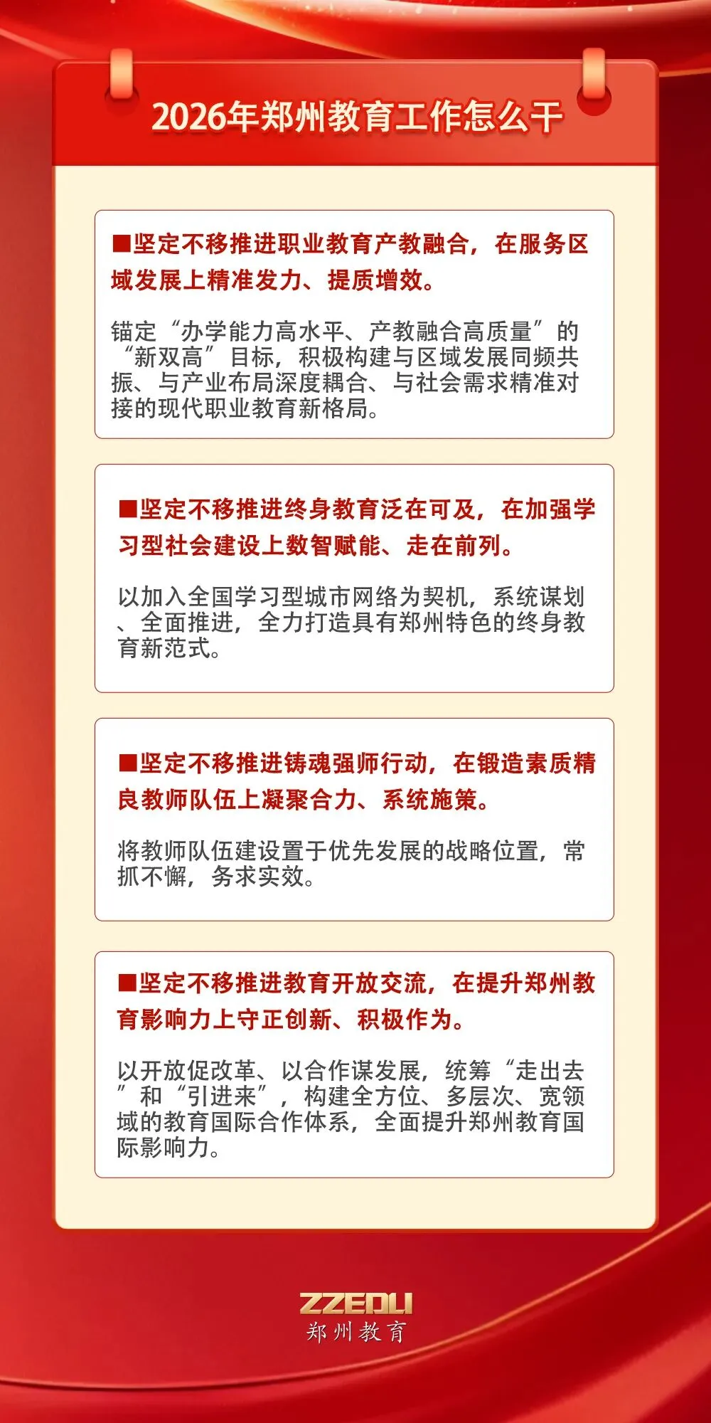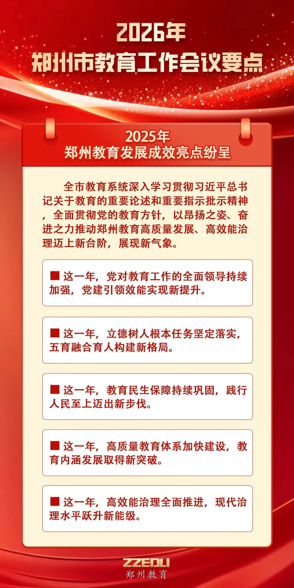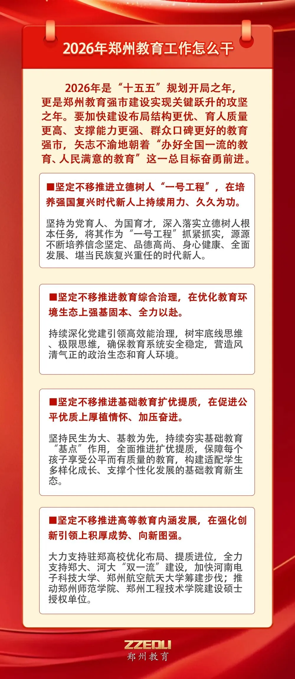 1月28日,2026年全市教育工作会议召开。会议强调了哪些内容?2026年郑州教育工作怎么干?组图为你划重点——
