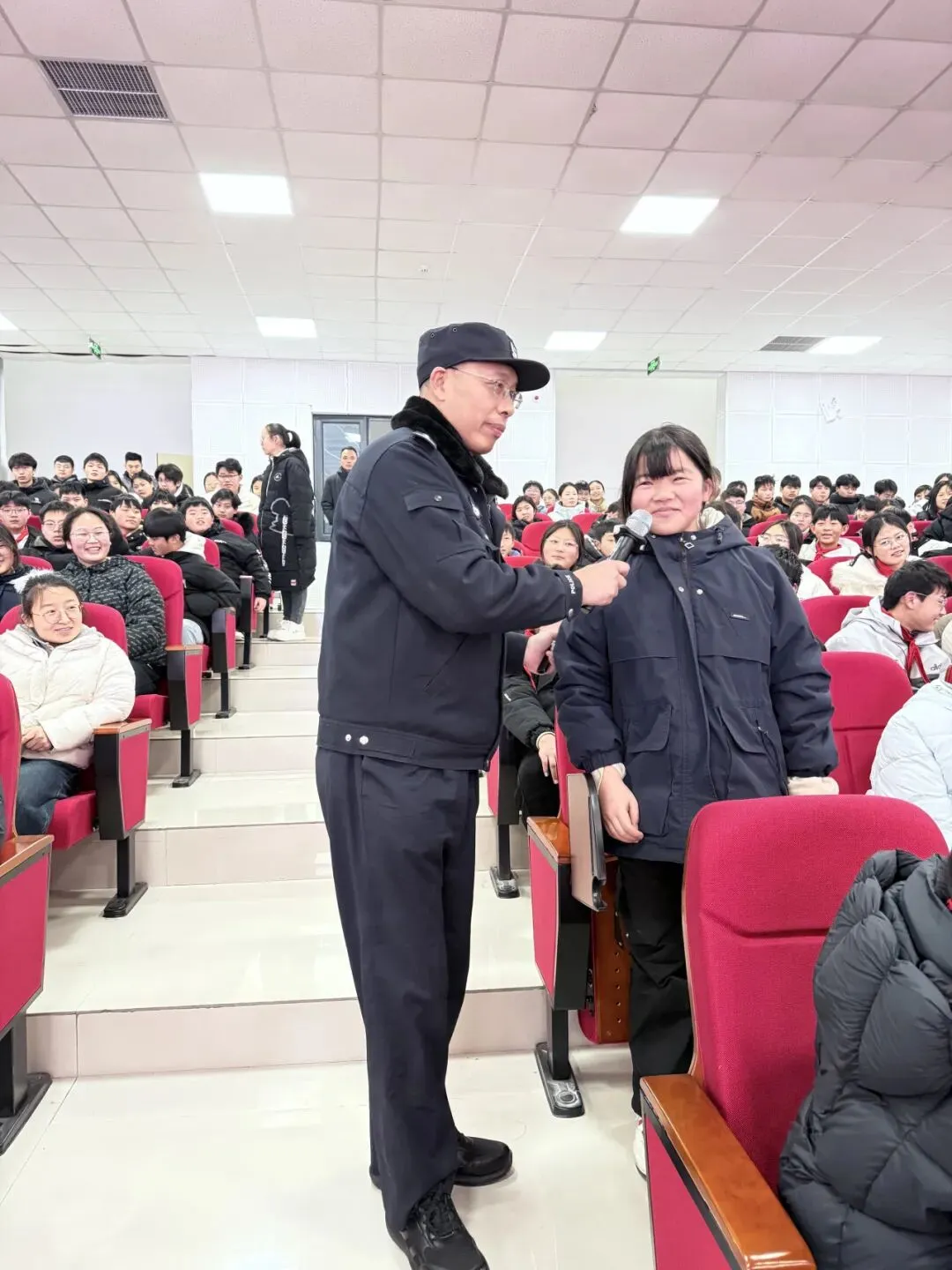 为增强宣讲实效性,讲座设置互动环节。警官针对讲解内容提出安全问题,学生们积极举手抢答,现场氛围热烈。针对学生的疑问,警官逐一耐心解答,通过问答互动加深学生对安全知识的记忆与理解。此外,警官还现场示范了灭火器的正确使用方法,从提、拔、握、压的操作步骤,到适用火灾类型、使用注意事项,逐一拆解演示,确保每位学生都能掌握基本使用技能。