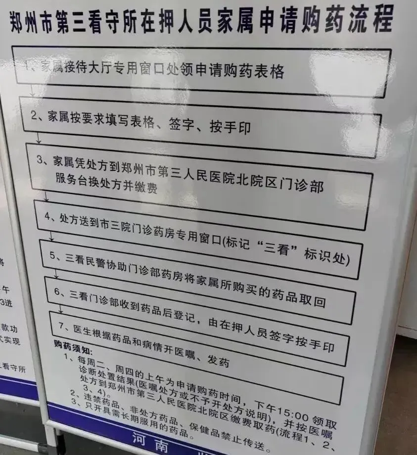 郑州市第三看守所接受患有疾病、需要长期服用药品的在押犯罪嫌疑人、被告人家属为其送药,具体申请购药流程如下: