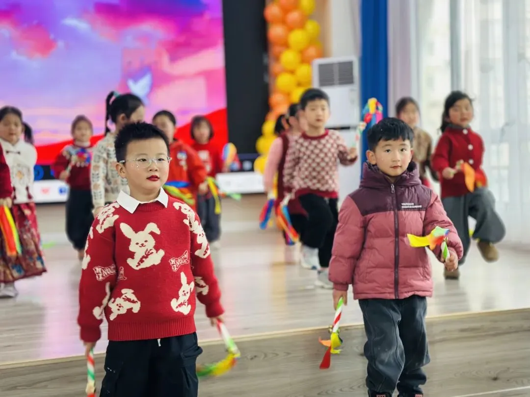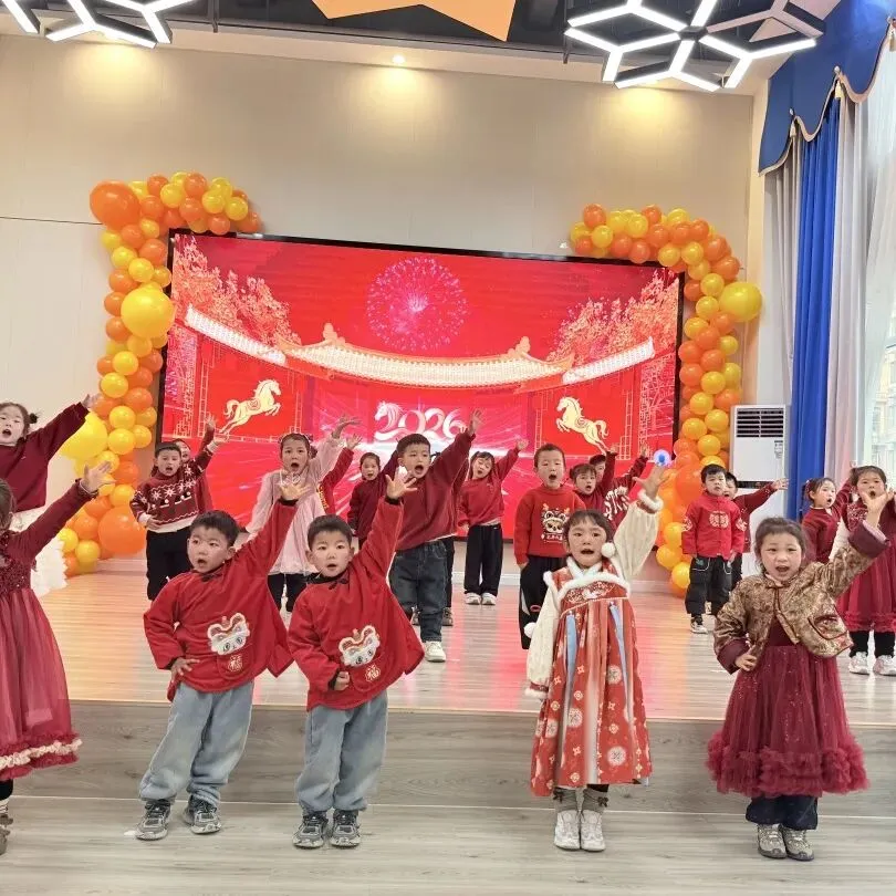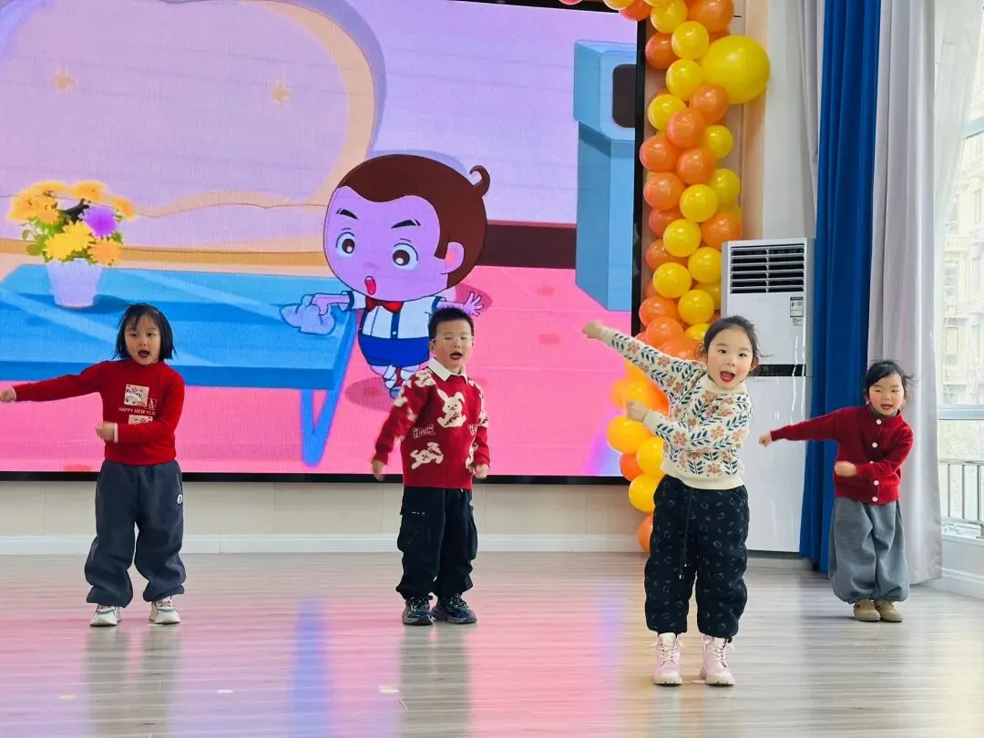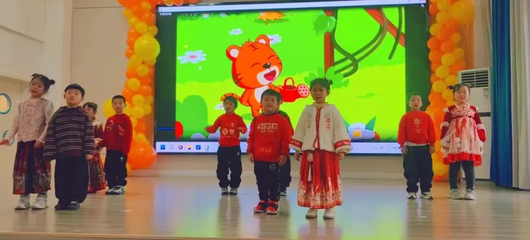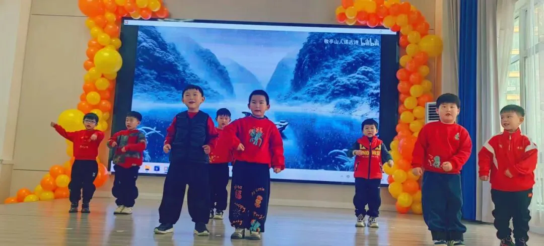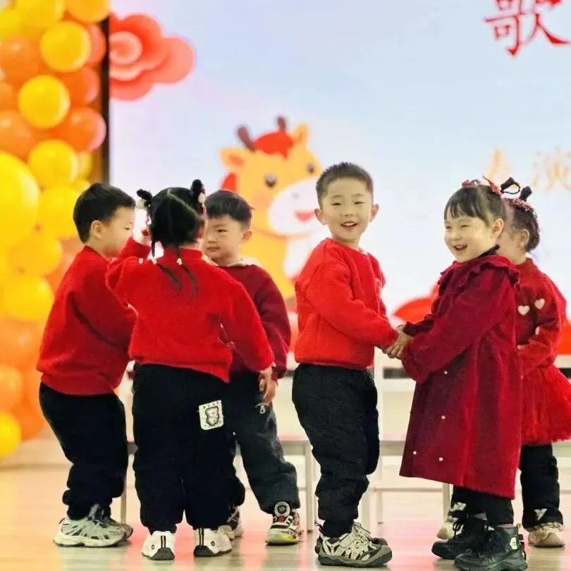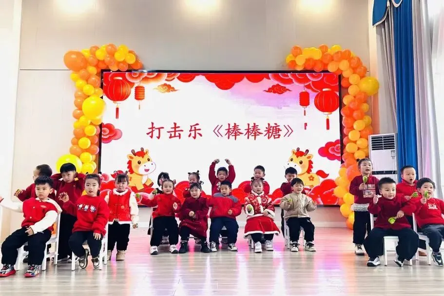 伴随着打击乐《棒棒糖》的轻快节奏,孩子们手拿乐器认真敲击,眼神亮晶晶;手指游戏与音乐律动中,每一个稚拙动作都透着投入与喜悦;童谣串烧更是童声琅琅,展现入园以来从胆怯到开朗的成长飞跃。最后全体萌娃齐声献唱《新年好》《成语拜新年》,用最纯粹清澈的歌声,传递满满温暖的新年祝福,现场俨然一片萌趣洋溢的童心海洋。
