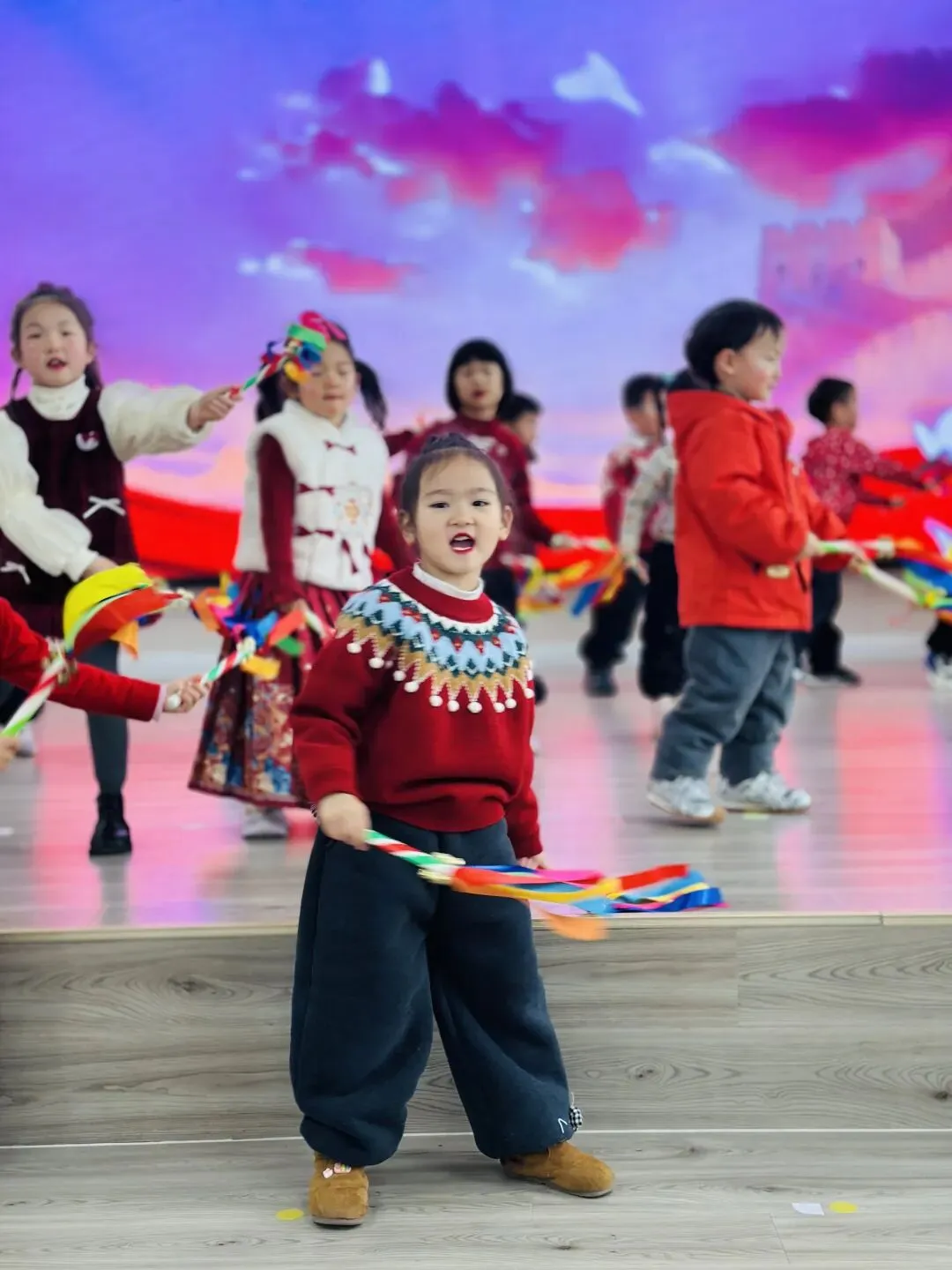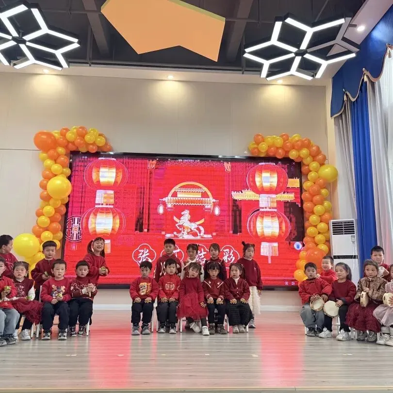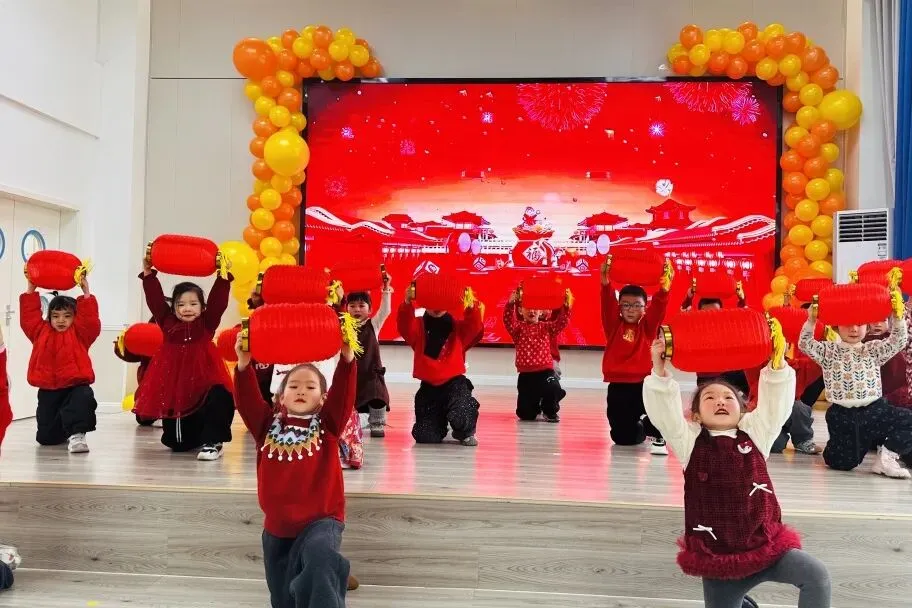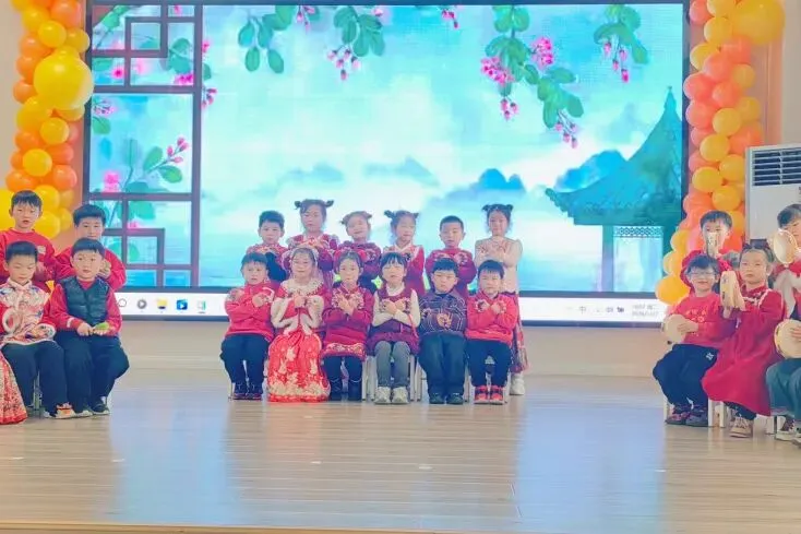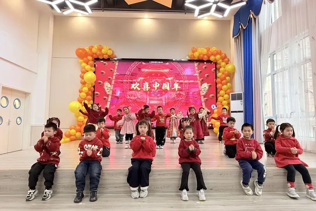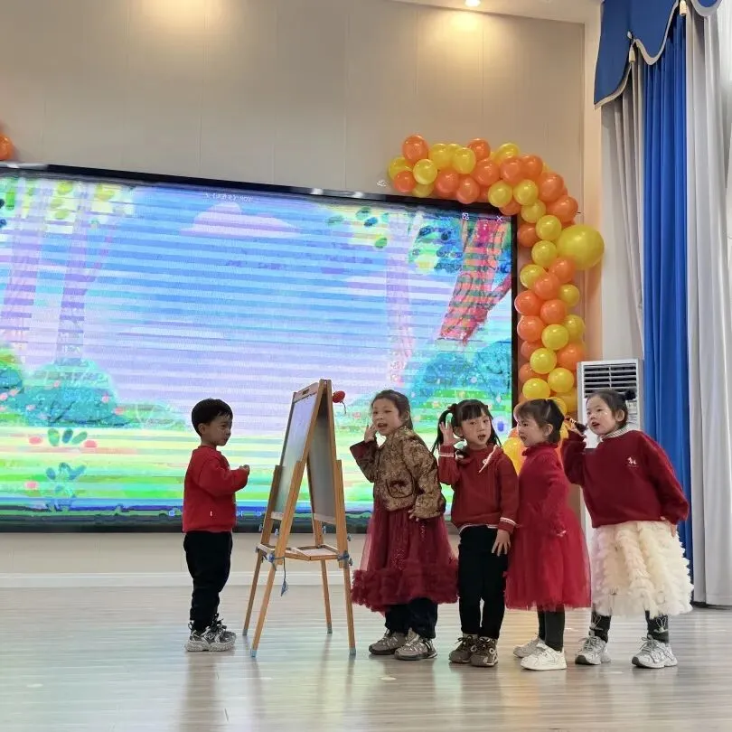 伴随着打击乐《棒棒糖》的轻快节奏,孩子们手拿乐器认真敲击,眼神亮晶晶;手指游戏与音乐律动中,每一个稚拙动作都透着投入与喜悦;童谣串烧更是童声琅琅,展现入园以来从胆怯到开朗的成长飞跃。最后全体萌娃齐声献唱《新年好》《成语拜新年》,用最纯粹清澈的歌声,传递满满温暖的新年祝福,现场俨然一片萌趣洋溢的童心海洋。