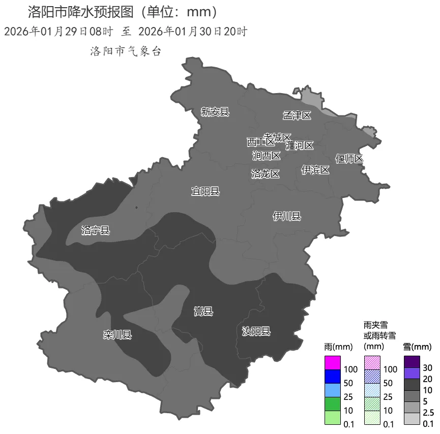 受西南暖湿气流和冷空气共同影响,预计1月29日至30日洛阳市将有一次明显降雪天气过程。大部分地区有中到大雪(3毫米至8毫米),局部暴雪。积雪深度2厘米至8厘米。全市有东北风3级至4级,阵风6级左右。