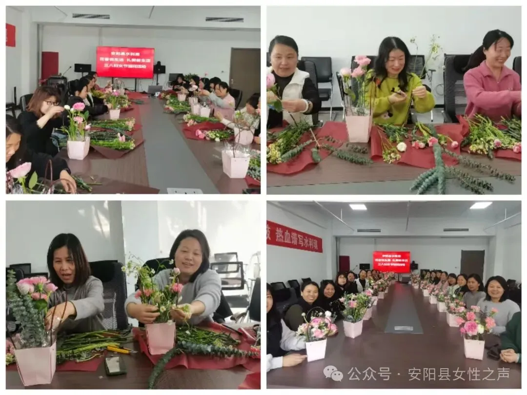 安阳县水利局精心组织了“花香悦生活 礼赞新时代”女职工插花活动。活动当日,20余名女职工齐聚一堂,在花香四溢中,女职工们发挥创意,将原本普通的花枝修剪、搭配,创作出一盆盆独具匠心的插花作品,现场满是欢声笑语,洋溢着温馨美好的节日氛围 。