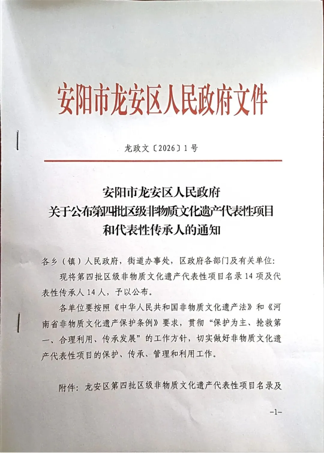 >安阳市龙安区人民政府关于公布第四批区级非物质文化遗产代表性项目和代表性传承人的通知
