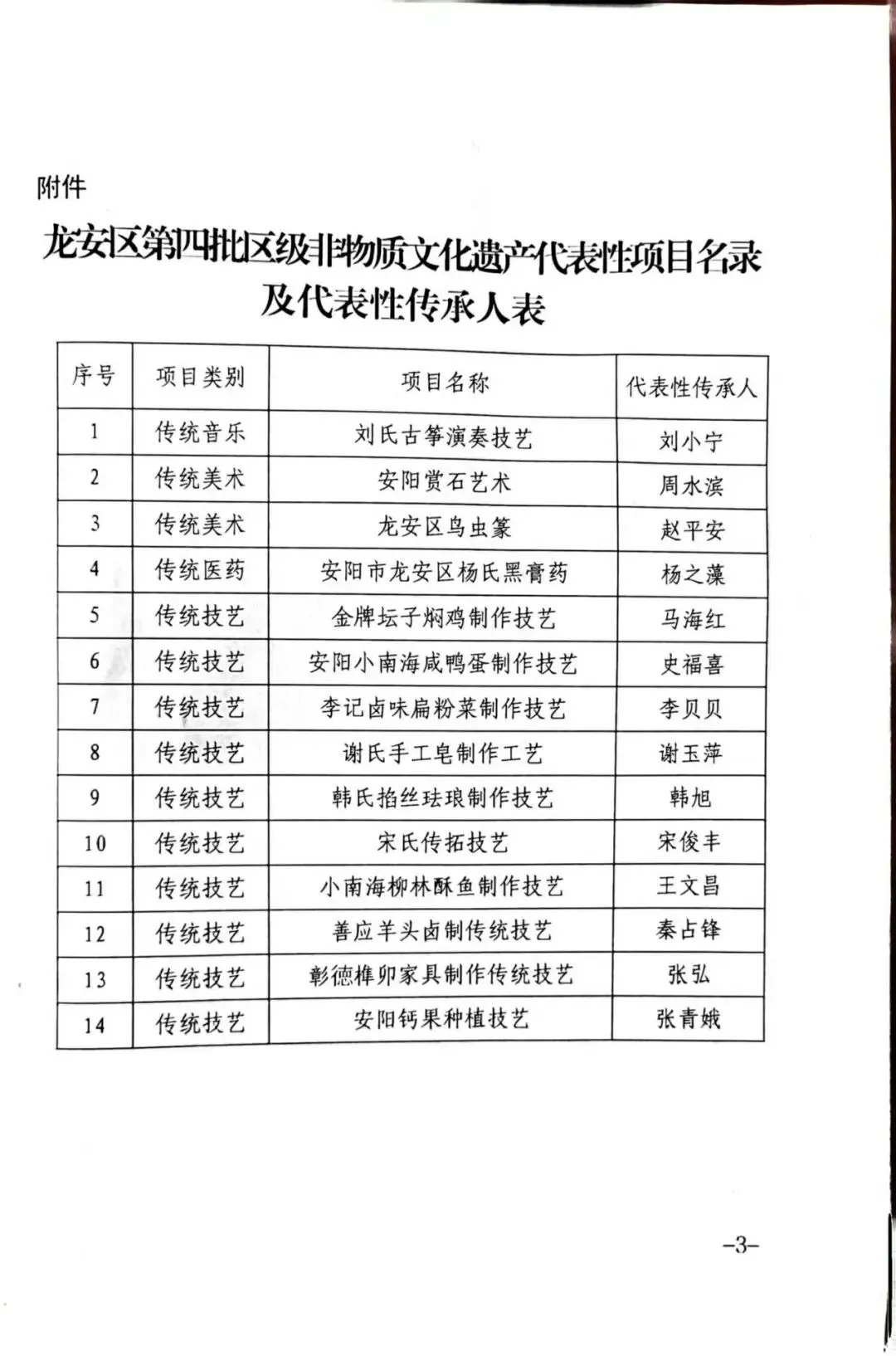 >安阳市龙安区人民政府关于公布第四批区级非物质文化遗产代表性项目和代表性传承人的通知