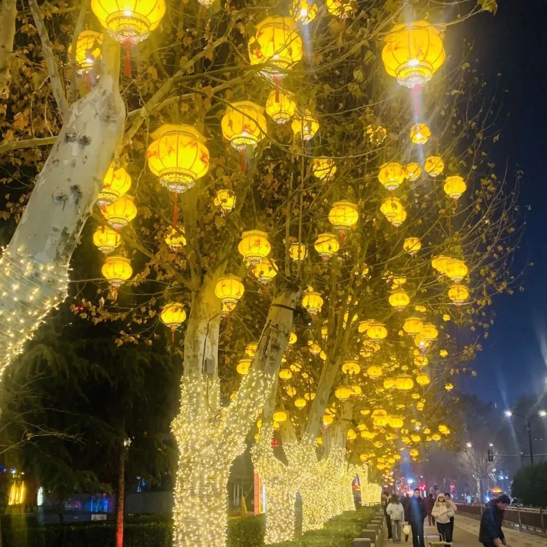 街上树上也挂上了宫灯,有红色的小圆灯,橙色的,橘色的,像是小柿子,可爱精致,像是秋天柿子红了的感觉。