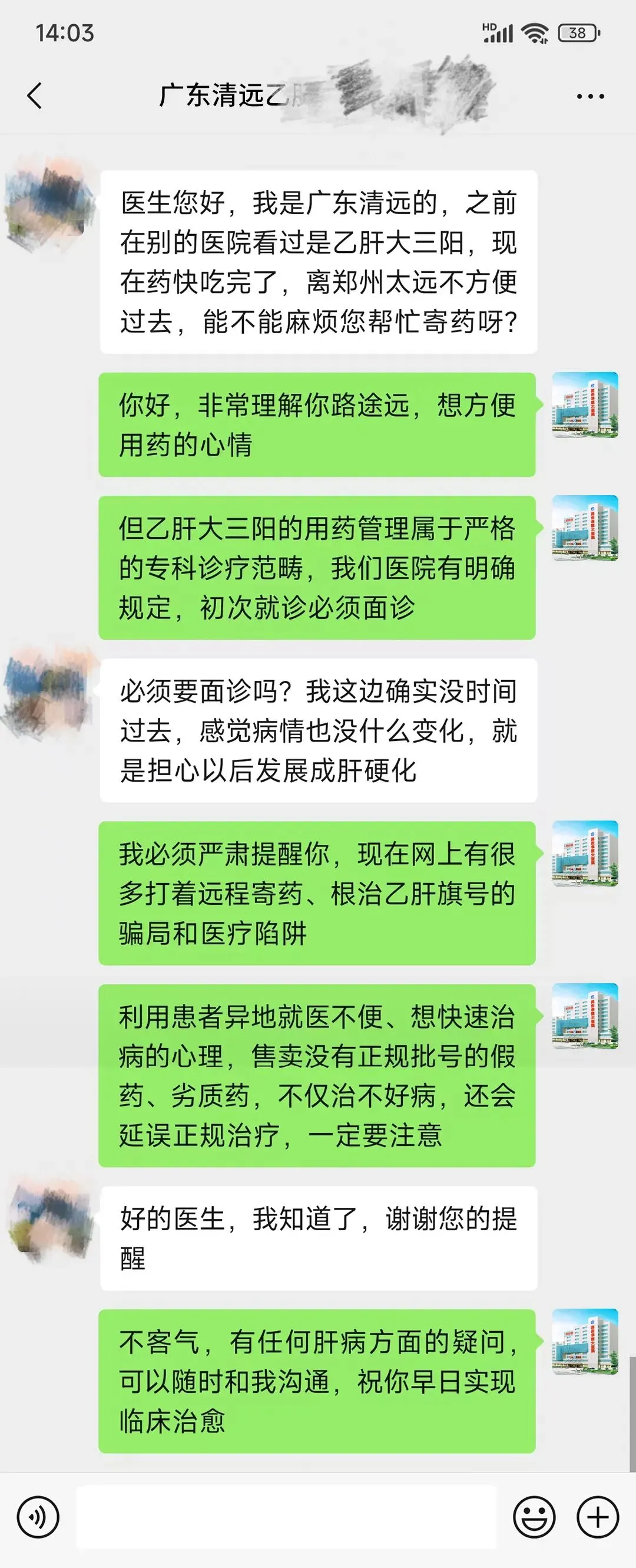 这位清远患者自幼携带乙肝病毒,此前在外院确诊为乙肝大三阳,一直坚持用药。如今药将用尽,了解到我院在治疗乙肝方面效果较为突出,便萌生了远程寄药的想法。我院医生在沟通中明确告知,乙肝大三阳的用药管理属于严格的专科诊疗范畴,我院规定初次就诊必须面诊,且远程寄药存在极大风险。