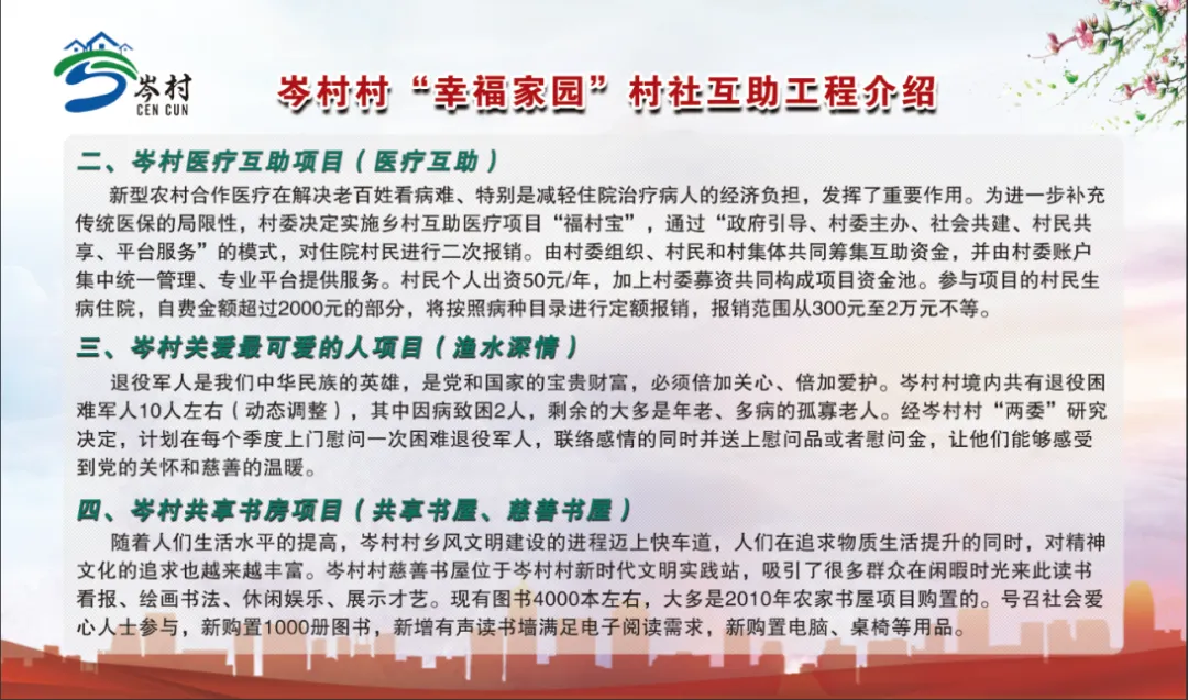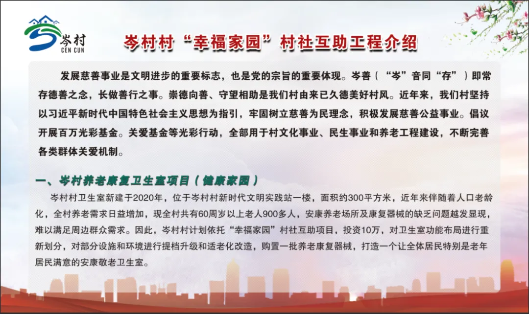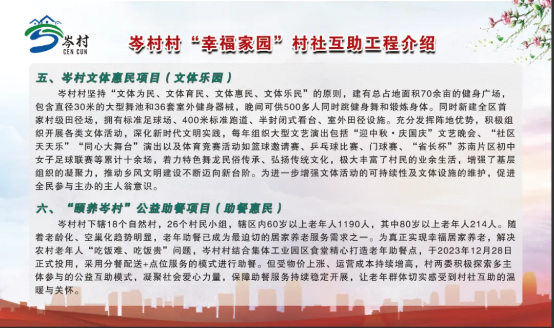 随后,调研组实地考察了岑村村“幸福家园”村社互助项目建设情况。岑村村作为武进区首个“幸福家园”村社互助示范村,于2021年8月启动,项目聚焦健康家园、医疗互助、鱼水深情、共享书屋、文体乐园、助餐惠民6大板块,截至目前已通过线上平台筹集善款118.38万元,为乡村美好发展、创新社会治理打下了坚实基础。
